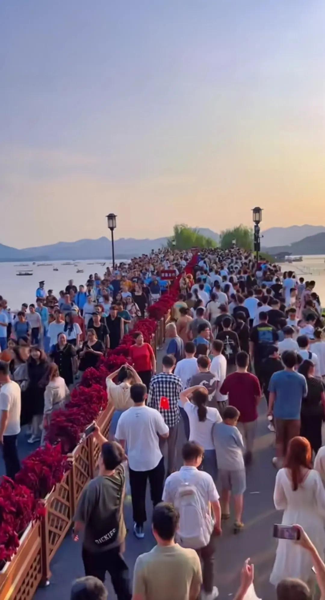 3、杭州西湖:五一假期第一天,杭州西湖遊客進入人從衆模式,杭州五一假期單日湧入52萬遊客,蘇堤、斷橋、遊船,湧金橋、集賢亭、九曲橋,遊客出現擁擠,杭州西湖爲什麼每逢節假日必堵,主要原因是杭州西湖作爲國家5a景區,從2002年免費對遊客開放,不收門票,一直受到好評如潮,西湖免費開放之後,不但沒有虧本,還階級性爲杭州旅遊帶來了更多收入(交通,旅遊特產,酒店,餐飲)都翻倍增加,如今旅遊不能單一看中景區門票)要把眼光放長遠一點,希望全國景區多跟西湖學習,把大門票免去,讓人人可以能進景區,帶動地方旅遊發展。