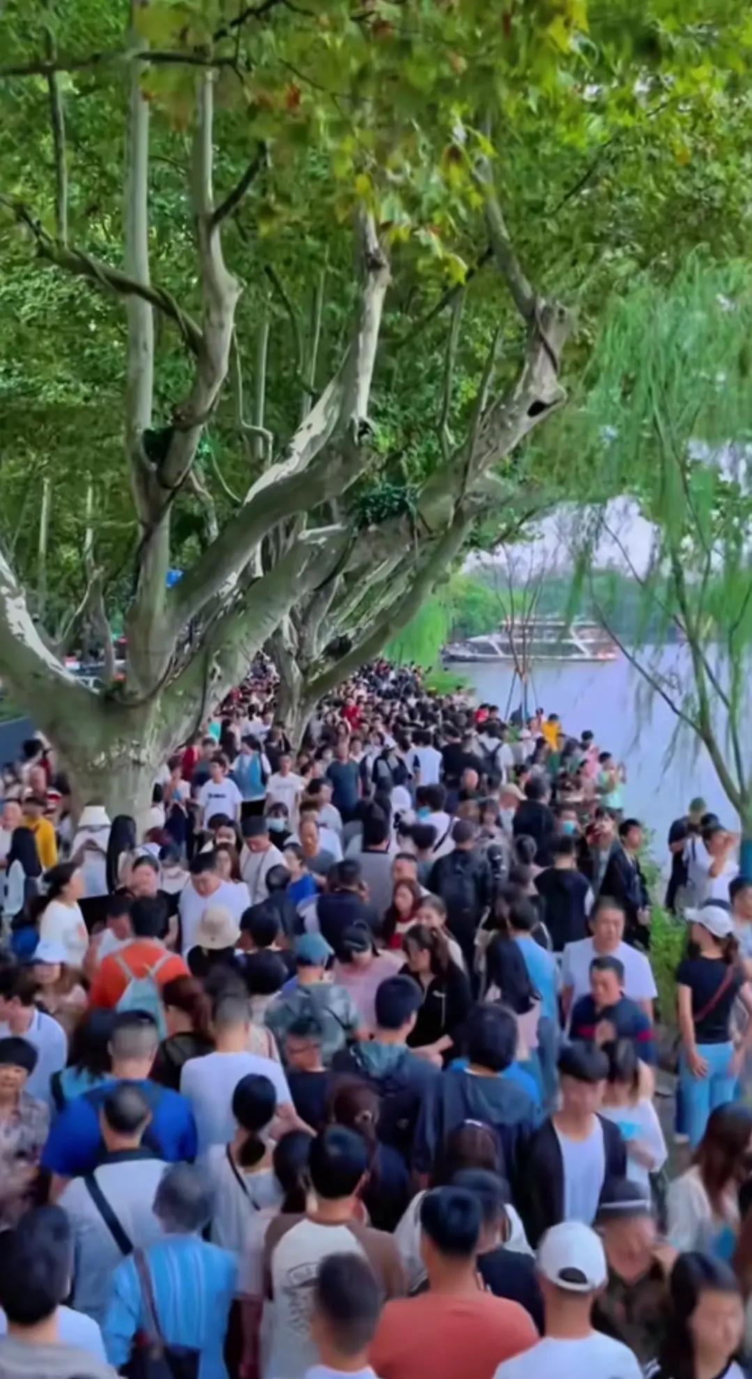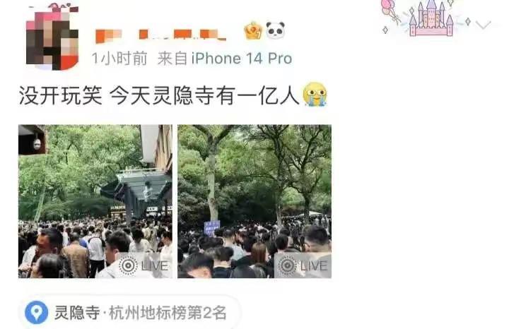 這個五一假期進入第二天,靈隱寺遊客網友現場發文,坐公交車鞋子被擠掉,用誇張說法,靈隱寺大約來了一億遊客,靈隱寺飛來峯半天就湧入5.2萬名遊客。
