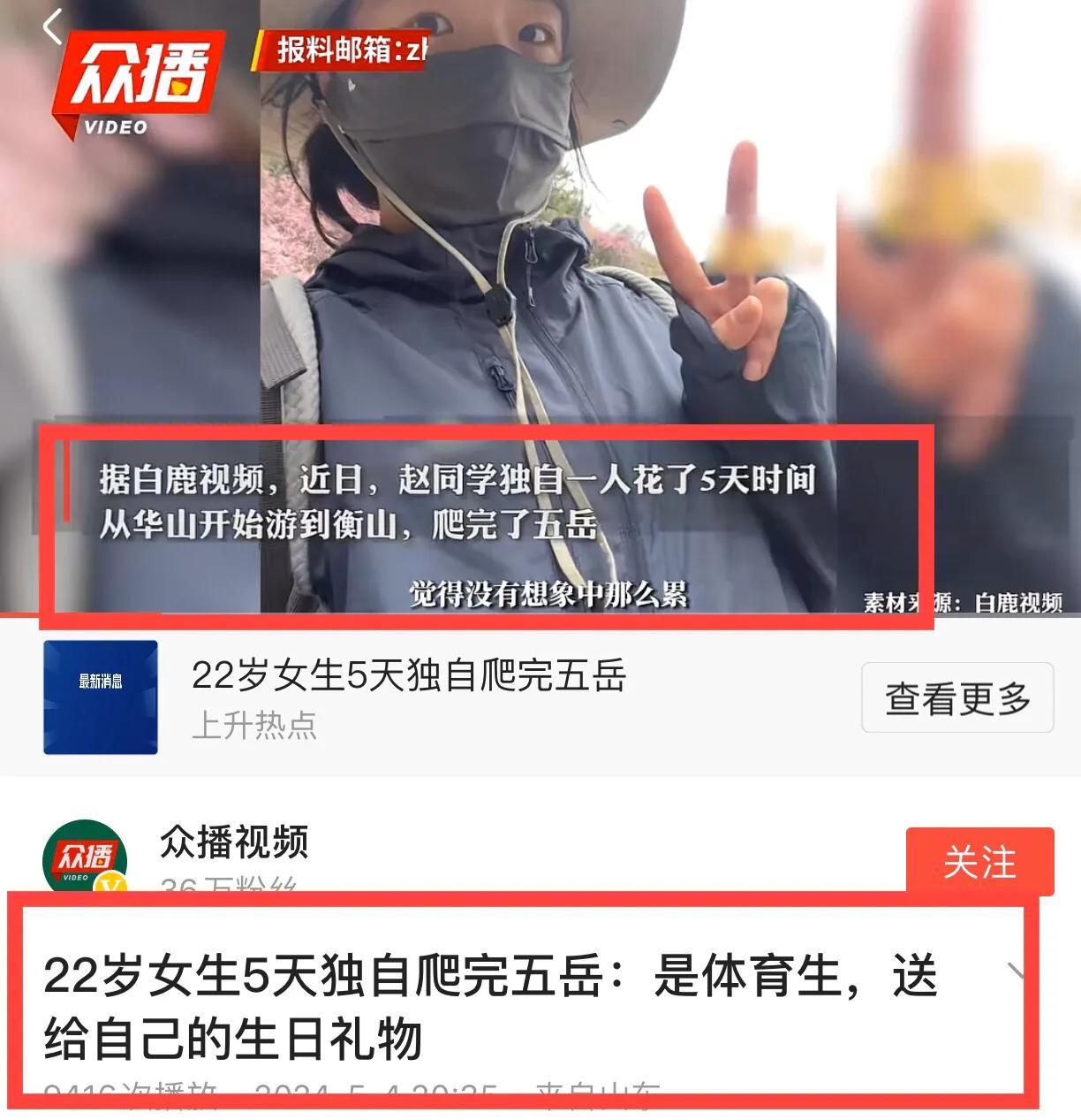 這個節假日又誕生一位旅遊特種兵,是一位22歲女生,具體來自哪裏不知道,她自己講述,就是趁自己生日來臨前給自己一個挑戰,2024年春節去爬了一次江西武功山,感覺不是很累,然後又刷到幾次有人5天挑戰五嶽,然後就嘗試一下,這位女生分享她挑戰五嶽的路線:25號西嶽華山,26號中嶽嵩山、27號東嶽泰山,28號北嶽恆山、29號南嶽衡山,爬完之後,她說感覺不累,因爲自己是體育生,平時也有鍛鍊。