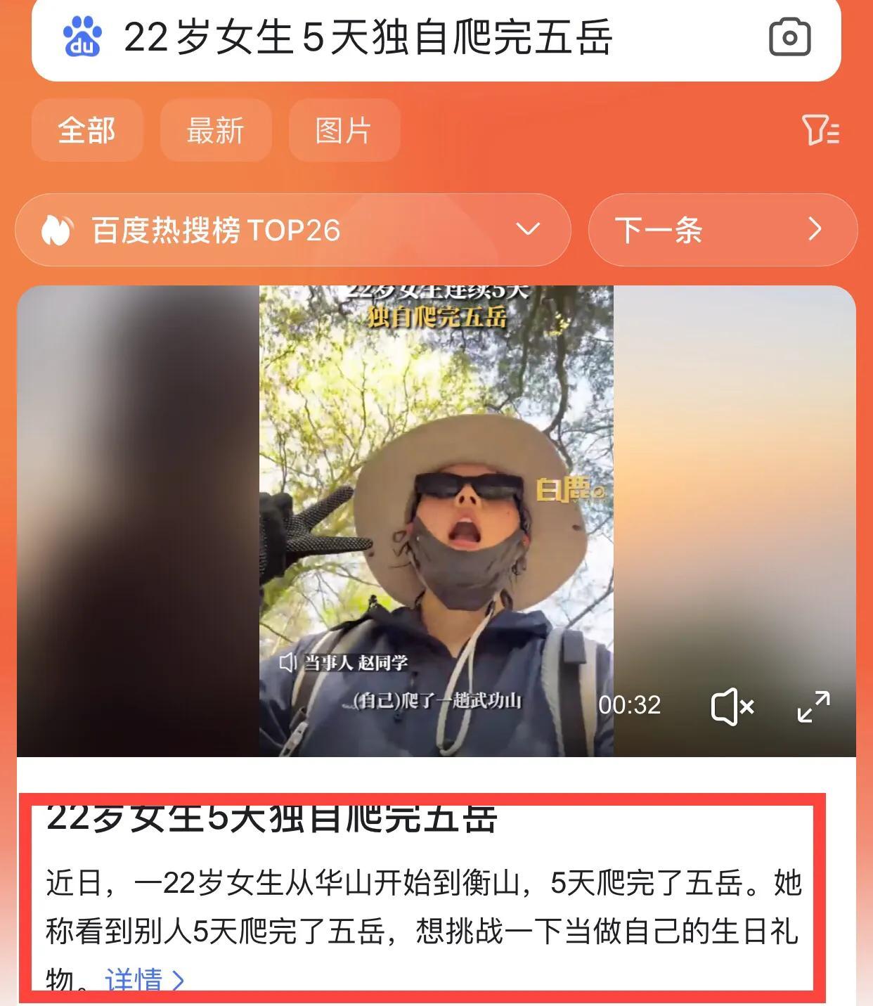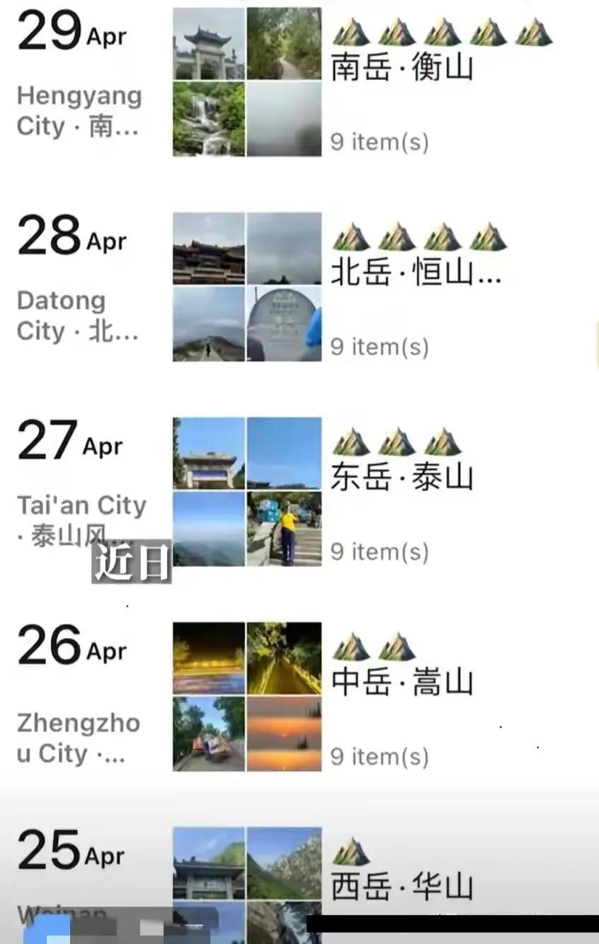 這個節假日又誕生一位旅遊特種兵,是一位22歲女生,具體來自哪裏不知道,她自己講述,就是趁自己生日來臨前給自己一個挑戰,2024年春節去爬了一次江西武功山,感覺不是很累,然後又刷到幾次有人5天挑戰五嶽,然後就嘗試一下,這位女生分享她挑戰五嶽的路線:25號西嶽華山,26號中嶽嵩山、27號東嶽泰山,28號北嶽恆山、29號南嶽衡山,爬完之後,她說感覺不累,因爲自己是體育生,平時也有鍛鍊。