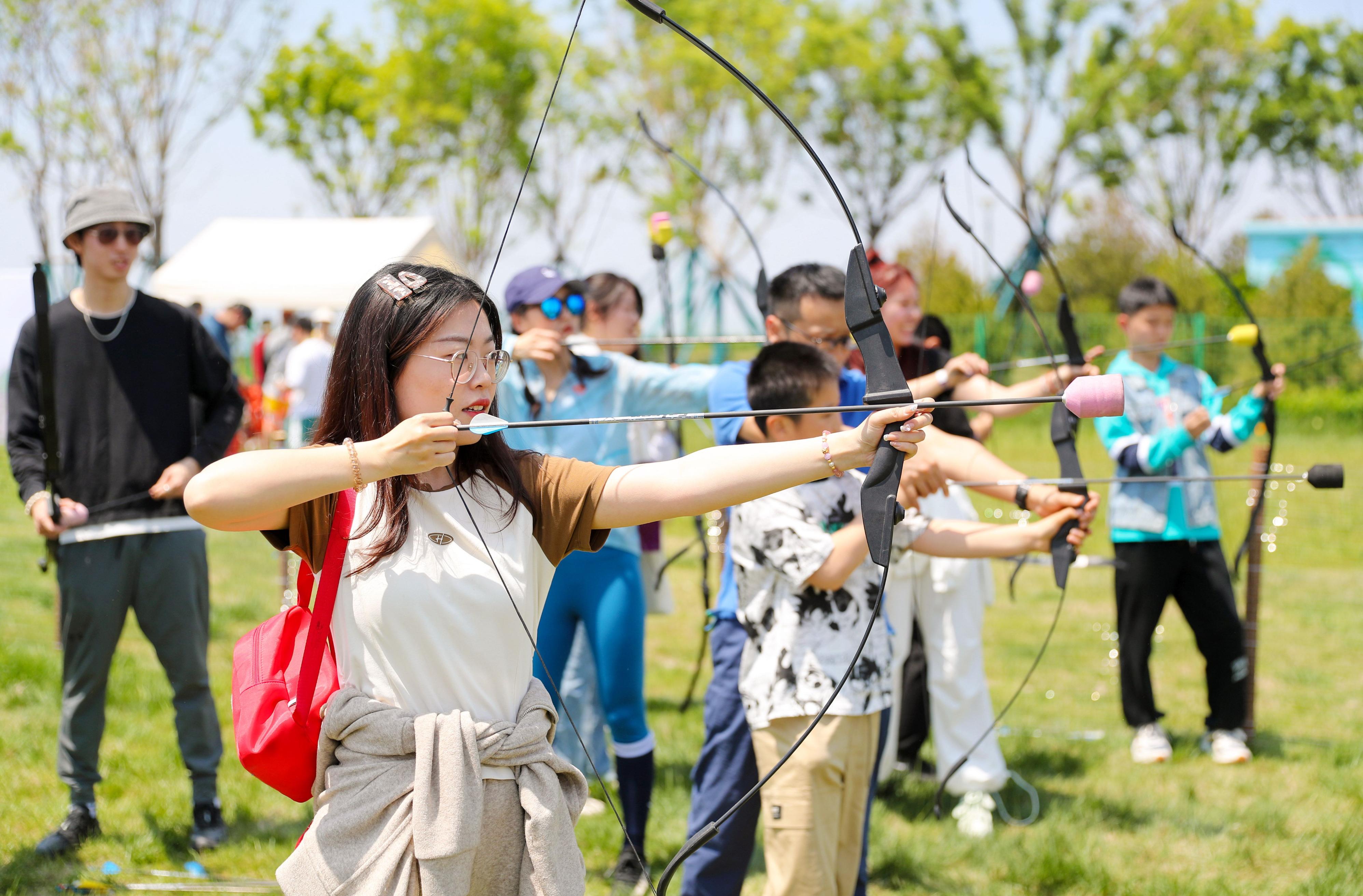 5月2日,遊客在青島濱海國際中心體驗射箭。張進剛 攝