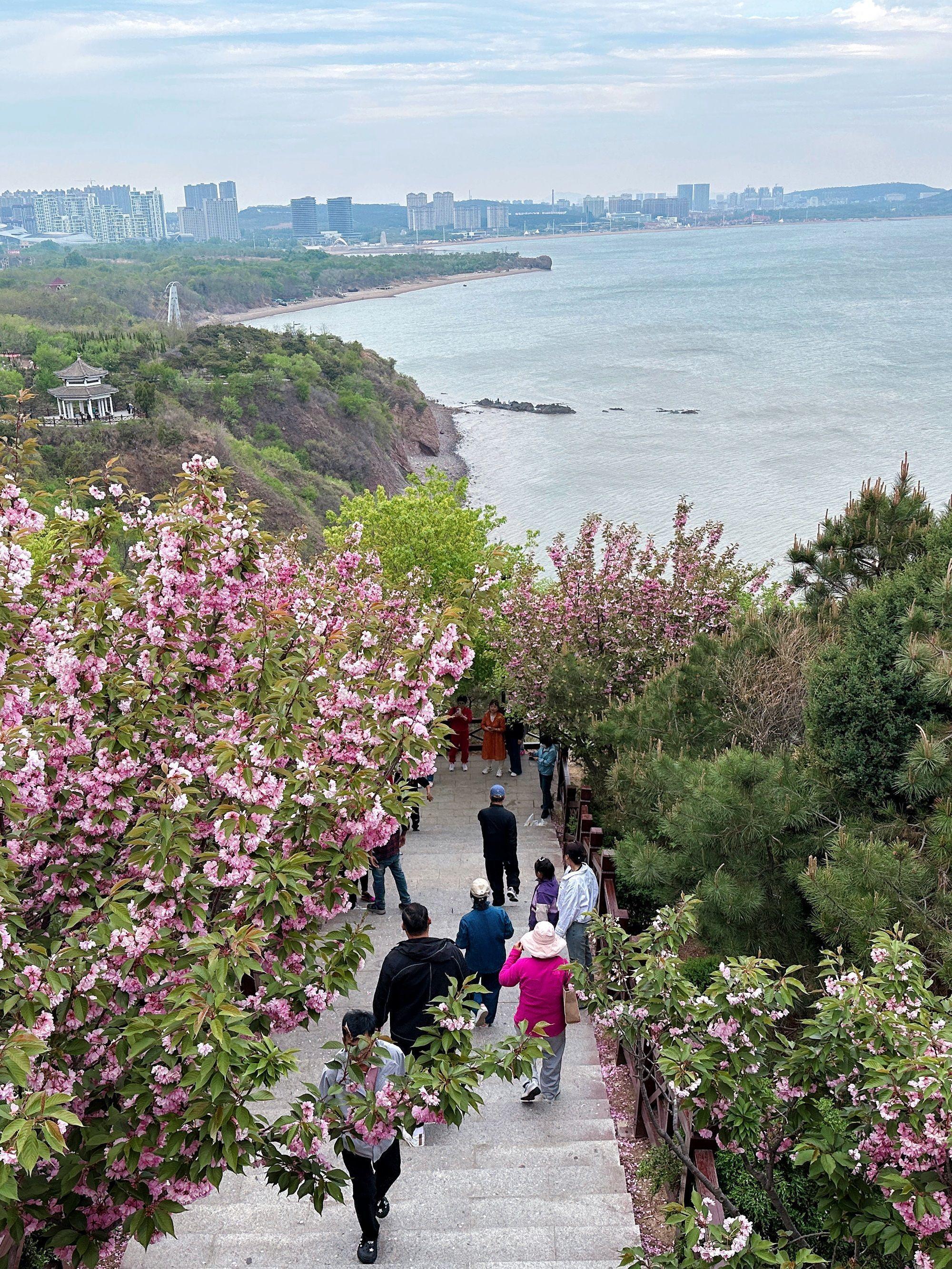 葫蘆島市興城海濱風景區是4A級旅遊景區,景區內有興海灣浴場、鳳棲灣浴場、邴家灣浴場、龍回頭,優美的自然景觀和優良的生態環境構成了著名的旅遊、度假勝地,每年吸引衆多中外遊客。圖爲5月4日,遊客在龍回頭賞花看海。 本報記者 鄧敏敏 攝