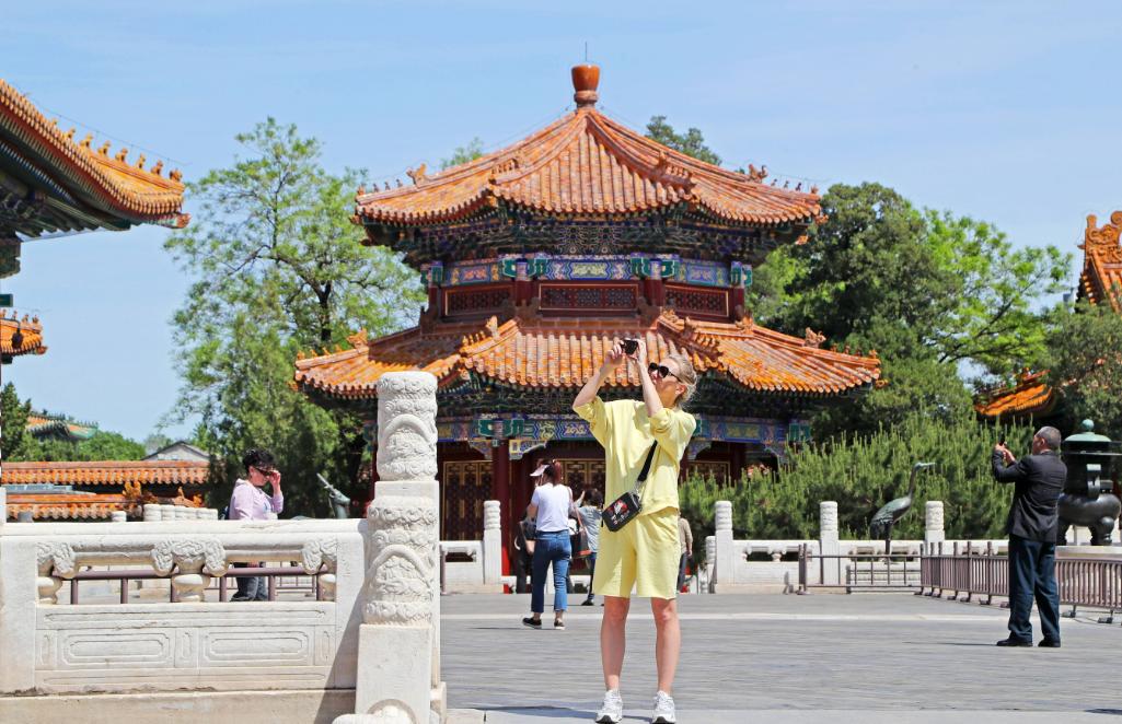5月2日,外國遊客在北京景山公園遊覽拍照。 本報記者 陳晨 攝