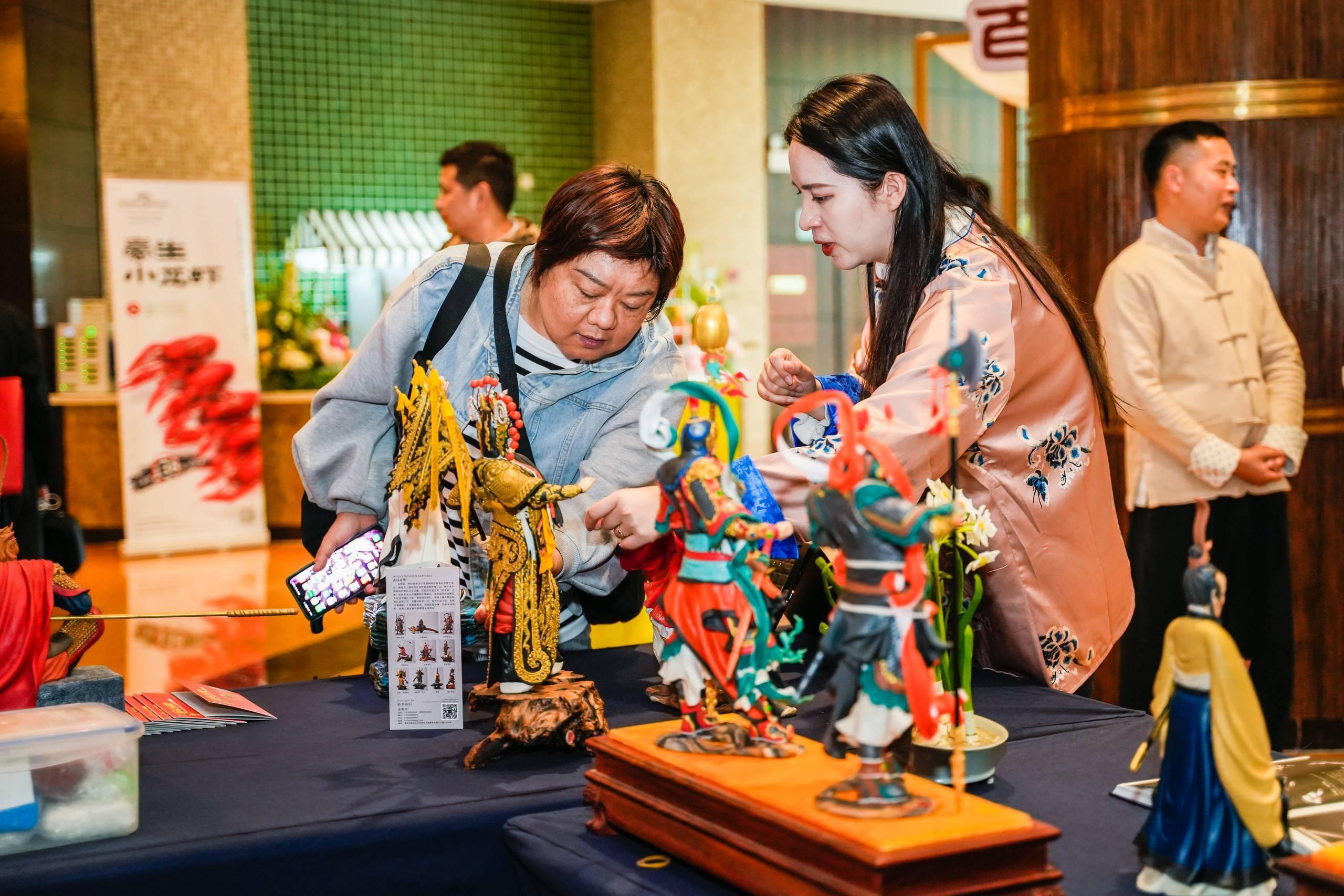 五一假期,武漢市文化和旅遊局組織開展“楚風漢韻·樂享非遺——非遺走進星級飯店”活動,以羣衆喜聞樂見的非遺技藝展示、非遺商品展賣等形式增強遊客體驗。圖爲遊客在星級飯店選購非遺商品。 曾維義 攝