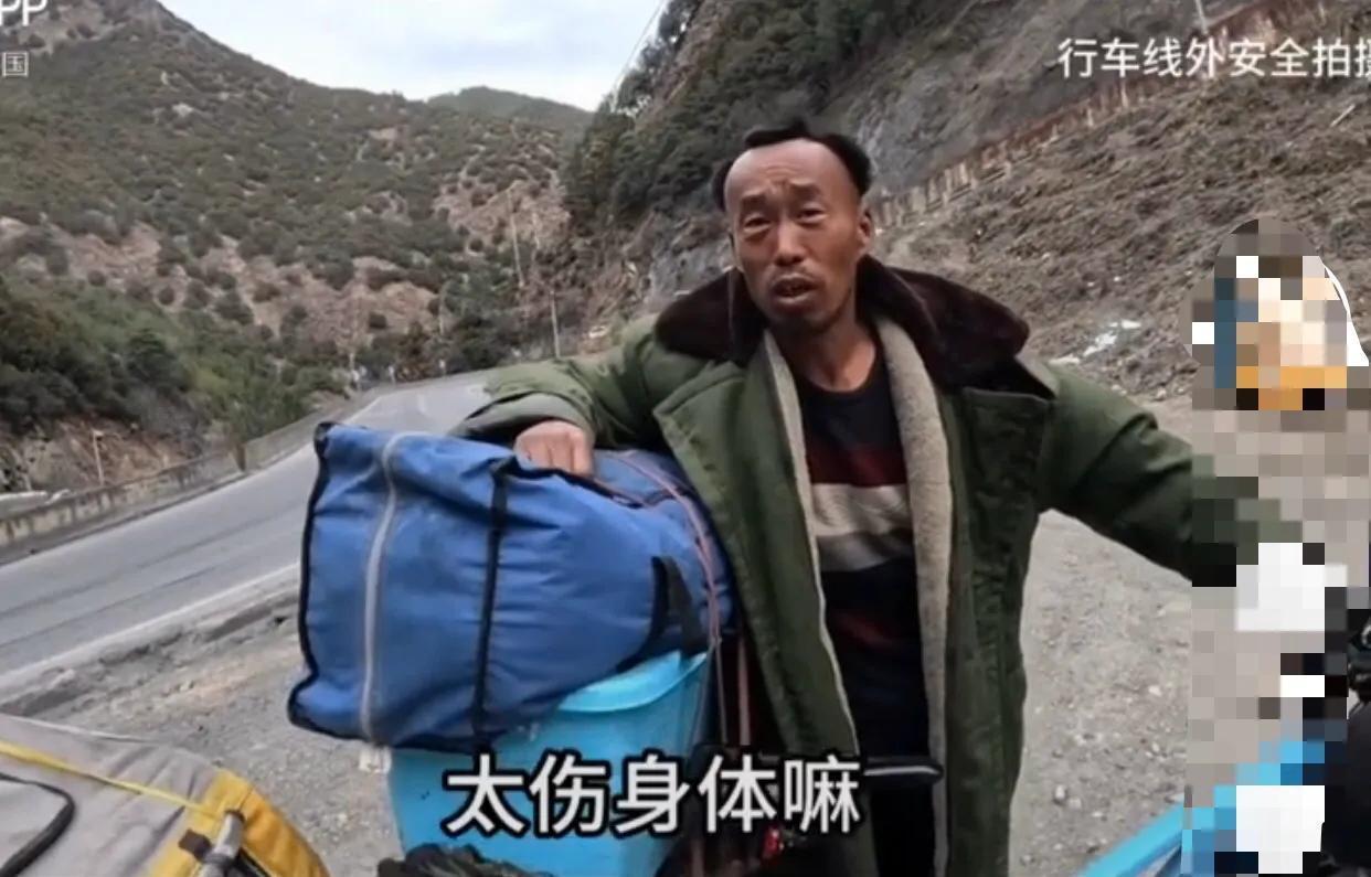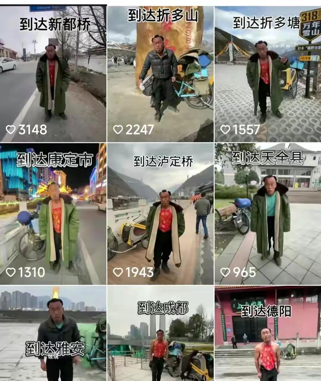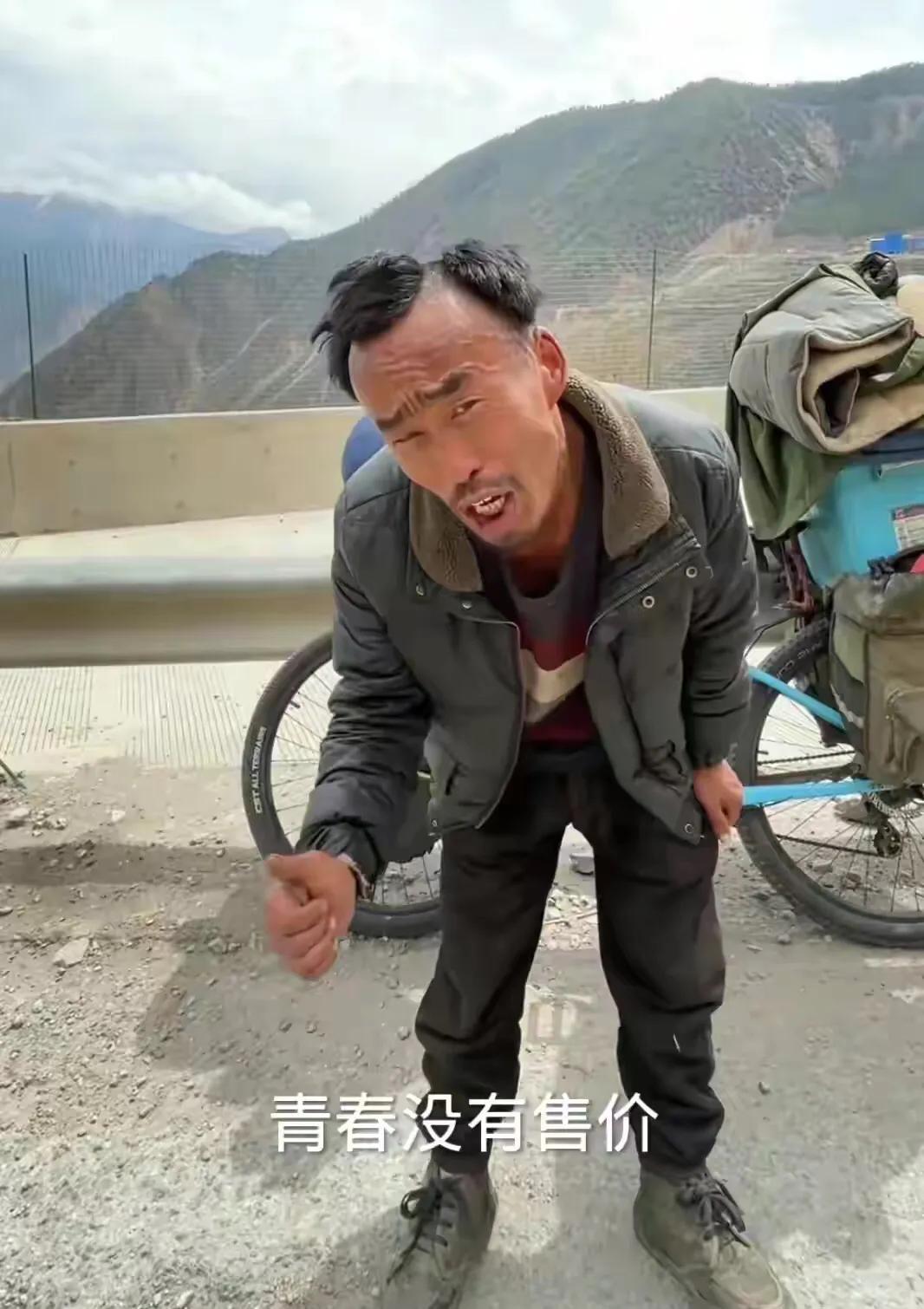 最近一位騎行者火啦,他走紅是因爲騎行期間西藏路上被一位女遊客拍下視頻放網上走紅,女遊客好奇他外表,禿頂稀疏的頭髮,傲黑的皮膚,衰老面孔,一幅營養不良的樣子,看起來就像60多歲老頭兒,女遊客是好奇他這個年紀騎行去拉薩,一路上身體支持得了嗎?