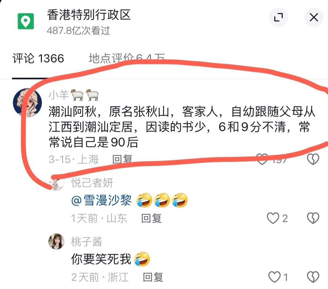 阿秋說自己90後,他爸50後,他媽70後,網友說阿秋的爸媽比阿秋年輕),一位網友調侃道:潮汕阿秋,原名張秋山,客家人,自幼跟隨父母從江西到潮汕定居,因讀的書少,6和9分不清,常常說自己是90後。