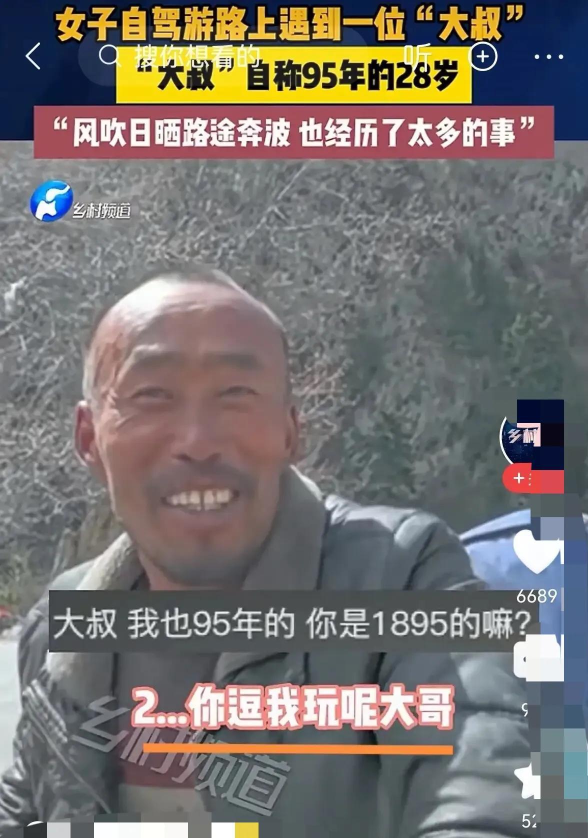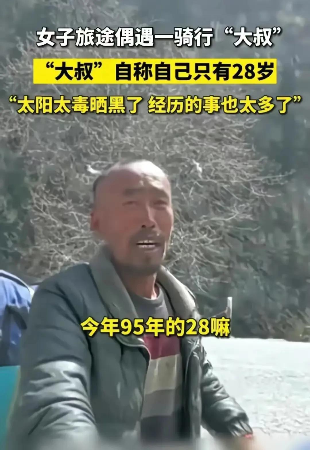 女遊客的獵奇心,騎行者告訴她,自己從山東威海騎行過來,騎行去拉薩,然後走219西藏阿里去新疆,女遊客問這位騎行者多大年齡,他說自己1995年出生,今年28歲,他一說自己28歲,女遊客簡直不敢相信,以爲自己聽錯了,她說大哥你逗我玩呢,他肯定的說自己就是28歲,因爲年齡與實踐面容完全不搭,蒼老的面孔比實際年齡至少相差40歲,95年的更像是59年的。