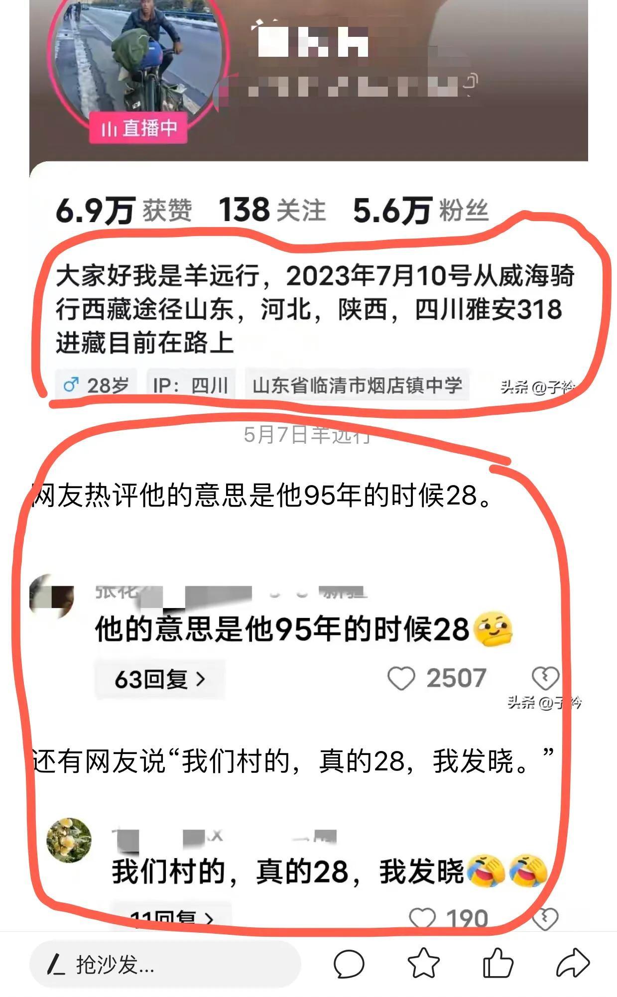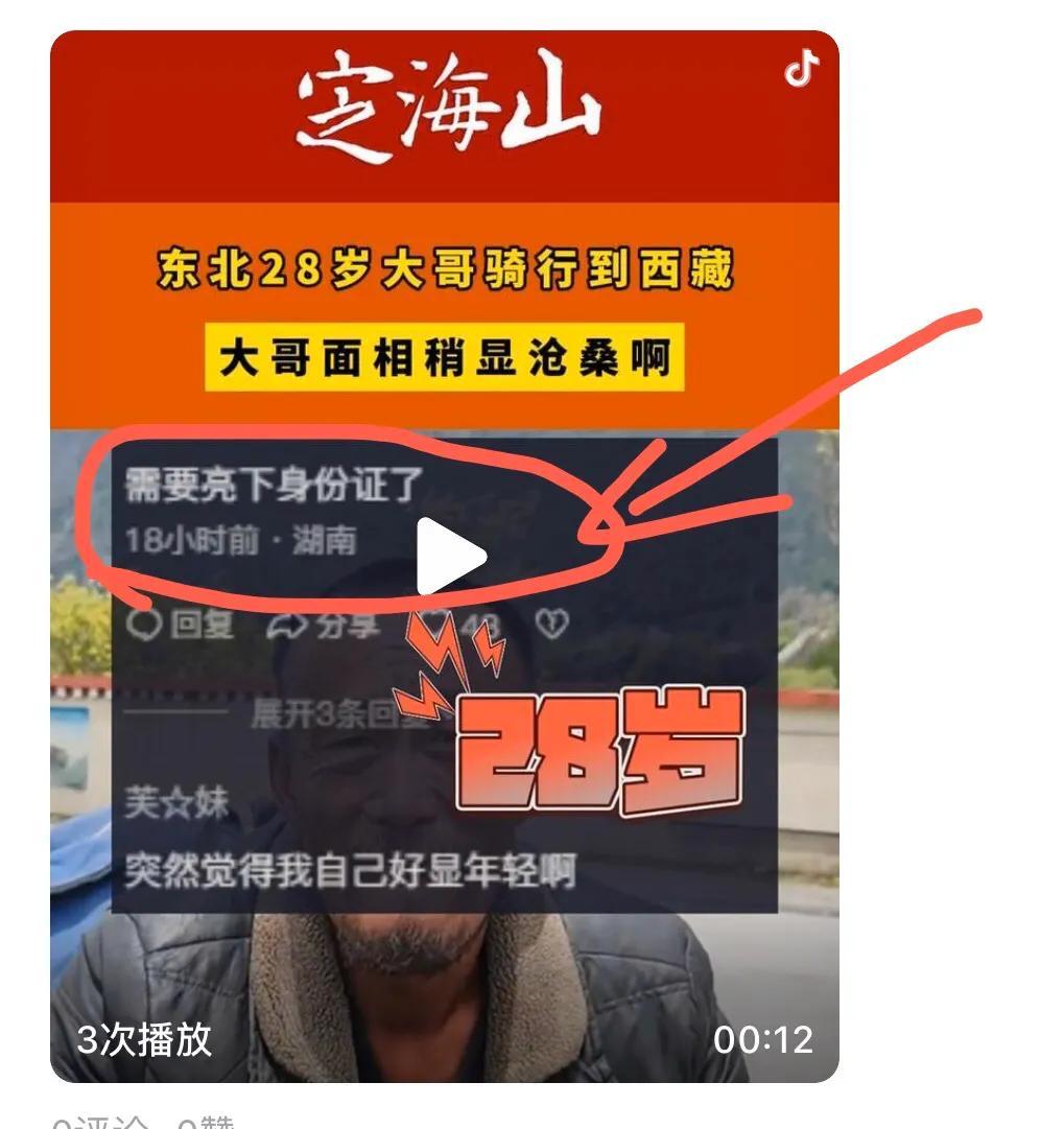 6、網友對他說的話也不太信:(他說95年28歲,這個也不對,95年今年虛歲30,實歲是29)。他自己抖音主頁上寫的2023年7月10號出發,這次騎行西藏才2個多月,他的視頻確實是今年2024一月份才發的,去年沒有發過視頻,2個月能衰老成這個樣子。網友希望他28歲必須亮身份證來證實一下自己真實年齡,不然沒人信他28歲。