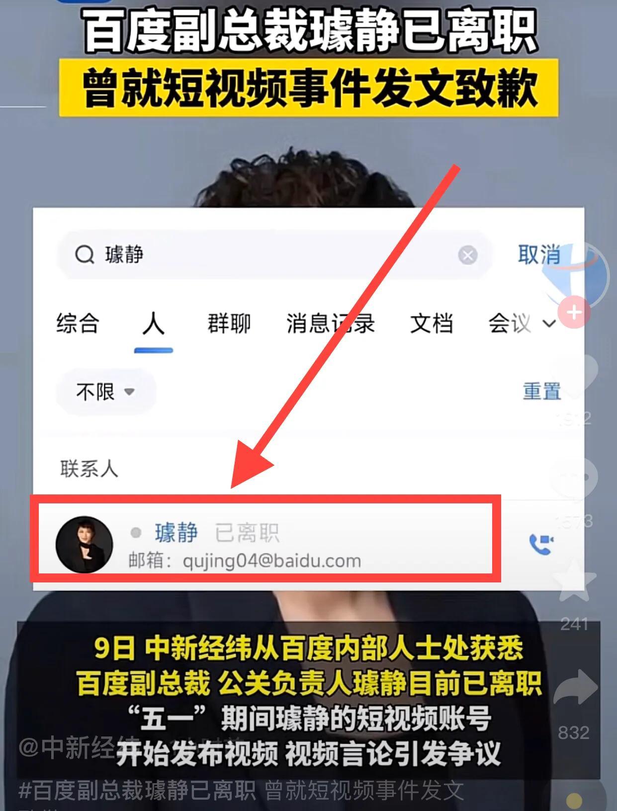 5月9日晚間多家媒體報道,並曬出截圖,璩靜郵箱後面顯示離職,璩靜在抖音上之前簡介爲(百度副總裁,如今也消除)。