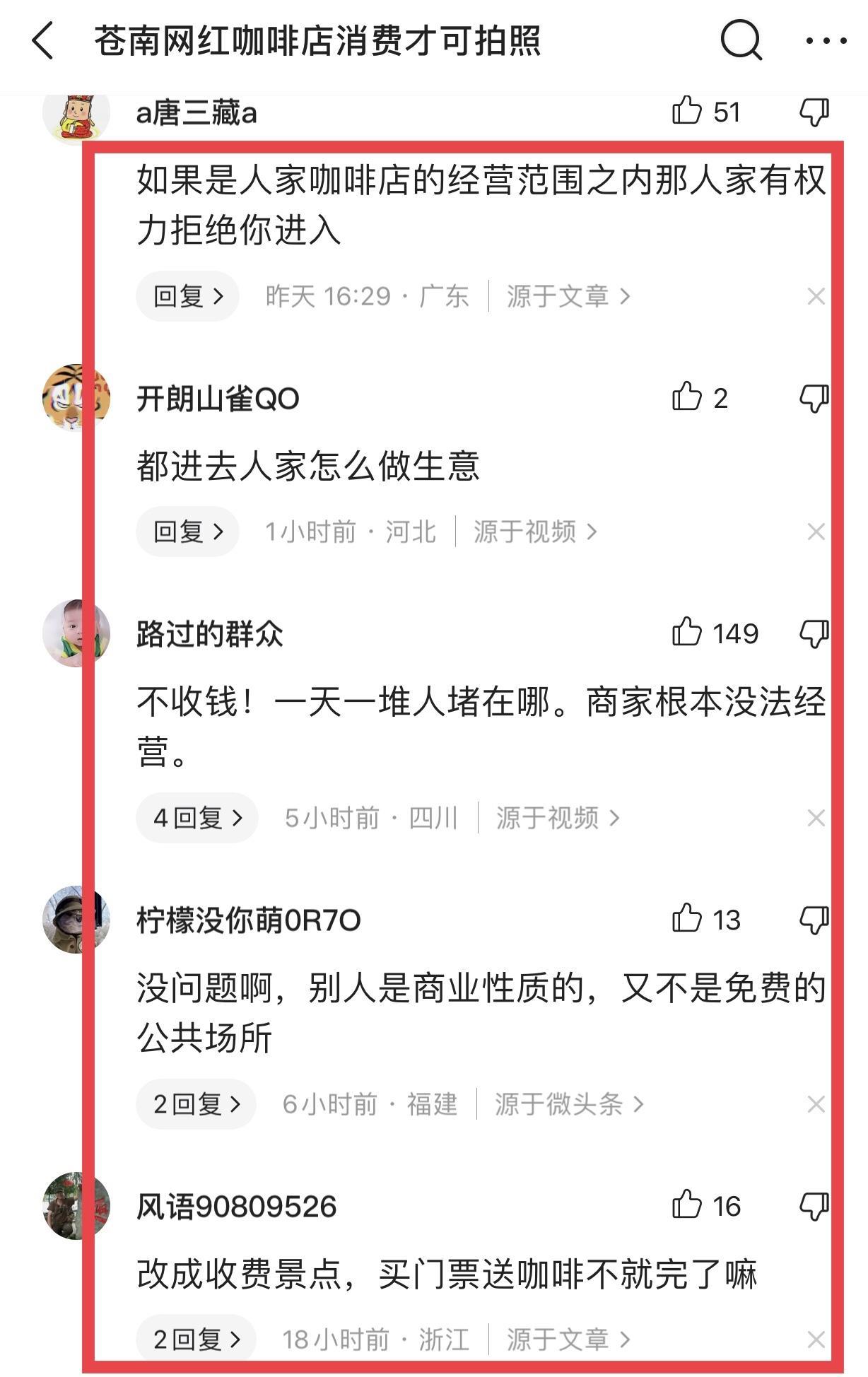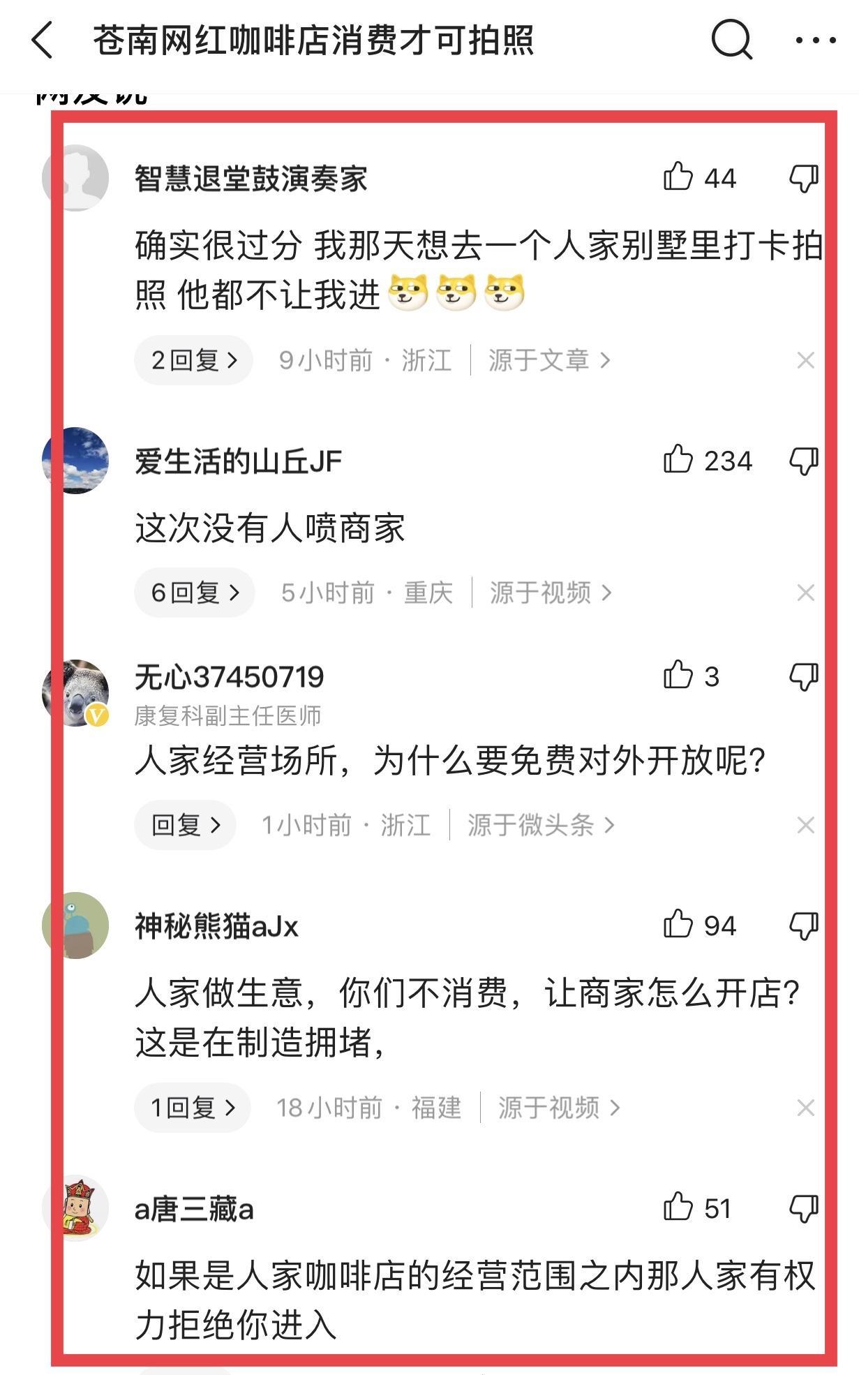網友們認爲,咖啡店如果是私人承包的,耗資鉅額房租,有權利拒絕遊客免費拍照,如果是景區的,那麼這種做法不對,但是大量網友還是支持商家做法,說太多遊客只想拍照,私人店鋪有人家經營權,遊客不應該雙標,道德綁架,不是誰人多,誰聲音大就有理由。