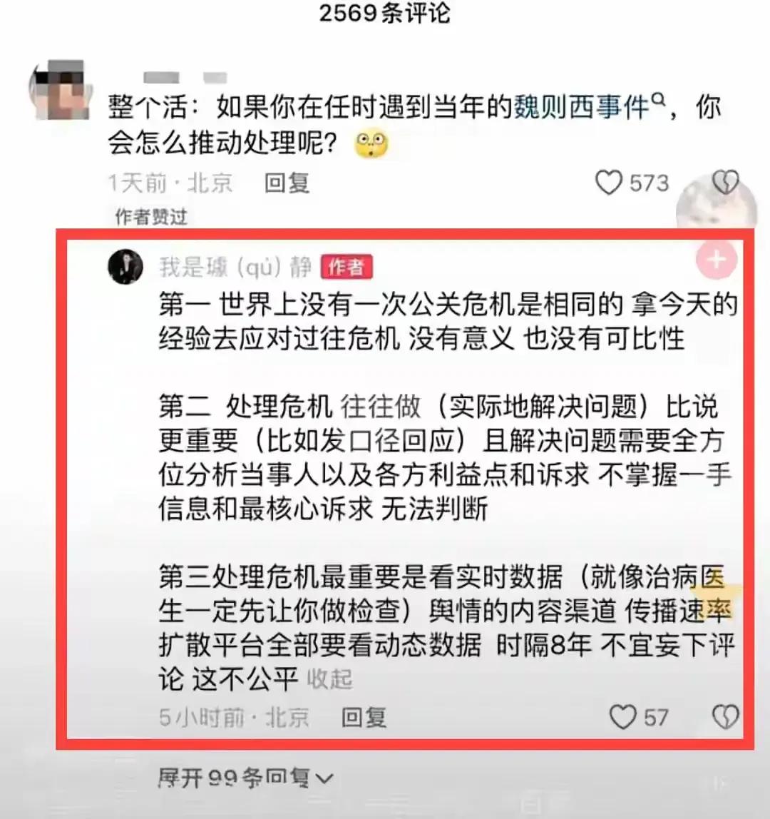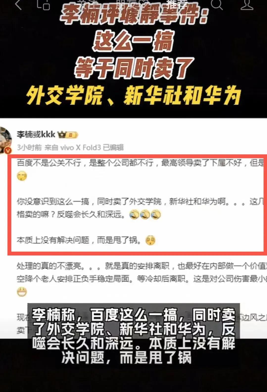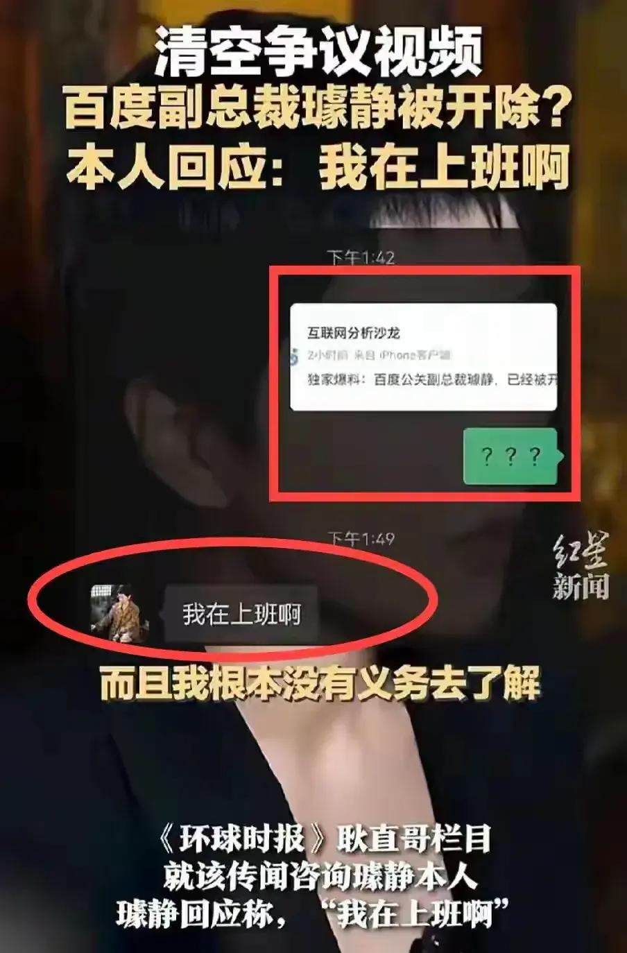 (十)最好的公關在大衆面前是默默無聞,在公司內部則是名聲大振,如果璩靜那四則職場視頻,在公司內部在正常不過,百度員工在他管轄之下,爲了五斗米折腰,這些在職場訓話被罵那就是家常便飯,網友上個網,別人不受你管轄,不拿你工資,憑什麼要聽你爹味十足的訓話,(網又既能載舟、亦能覆舟)。