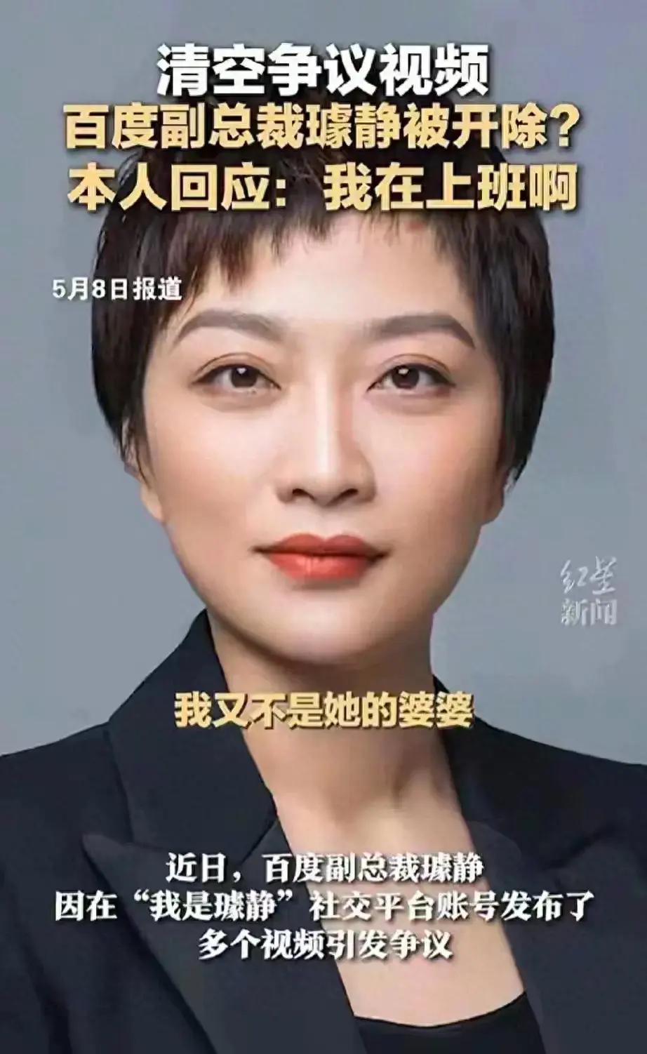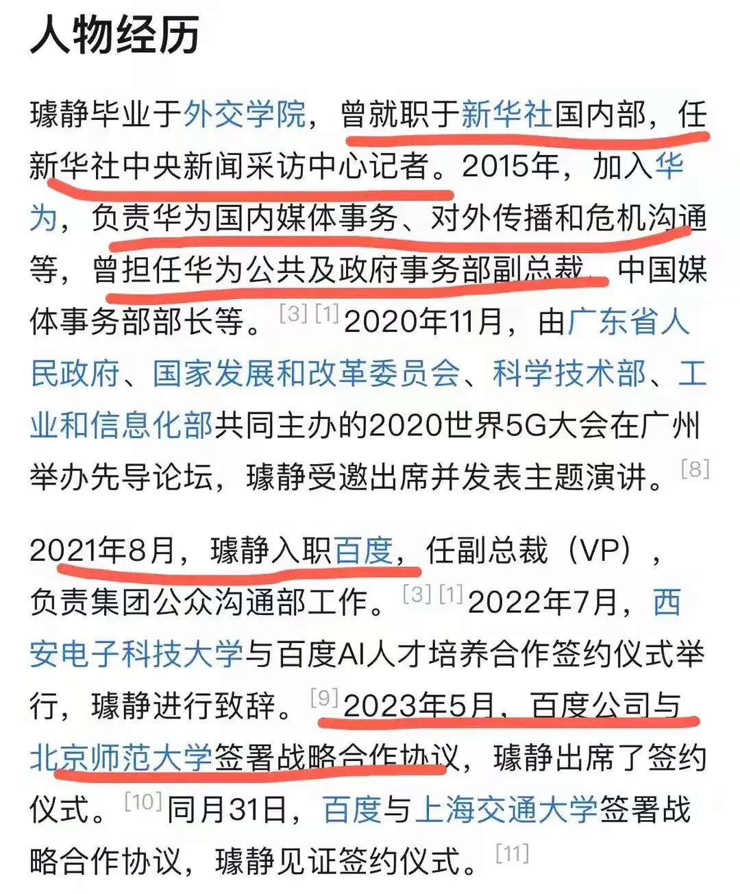 (二)說起璩靜,算是女性職場精英中的精英,用膚白貌美,才華與美貌集於一身,她都擁有了,有幸福家庭,光鮮亮麗工作,璩靜畢業於外交學院,開始就職於新華社新聞採訪記者,2015年入職華爲,擔任華爲公關副總裁,2021年入職百度副總裁,2023年百度與首都師範大學簽約合作協議璩靜親自到場,一路走來順風順水,沒想到最後因爲在自媒體上翻車了,職場算是走到了盡頭。