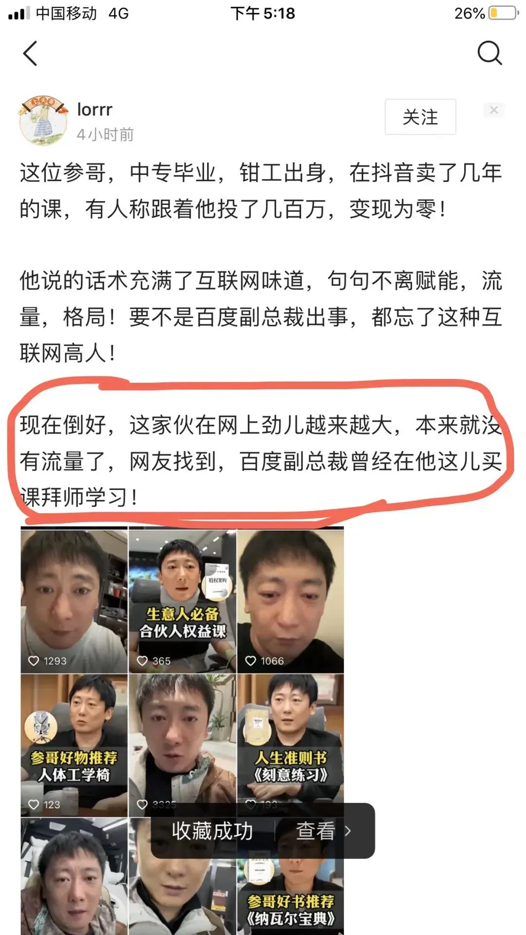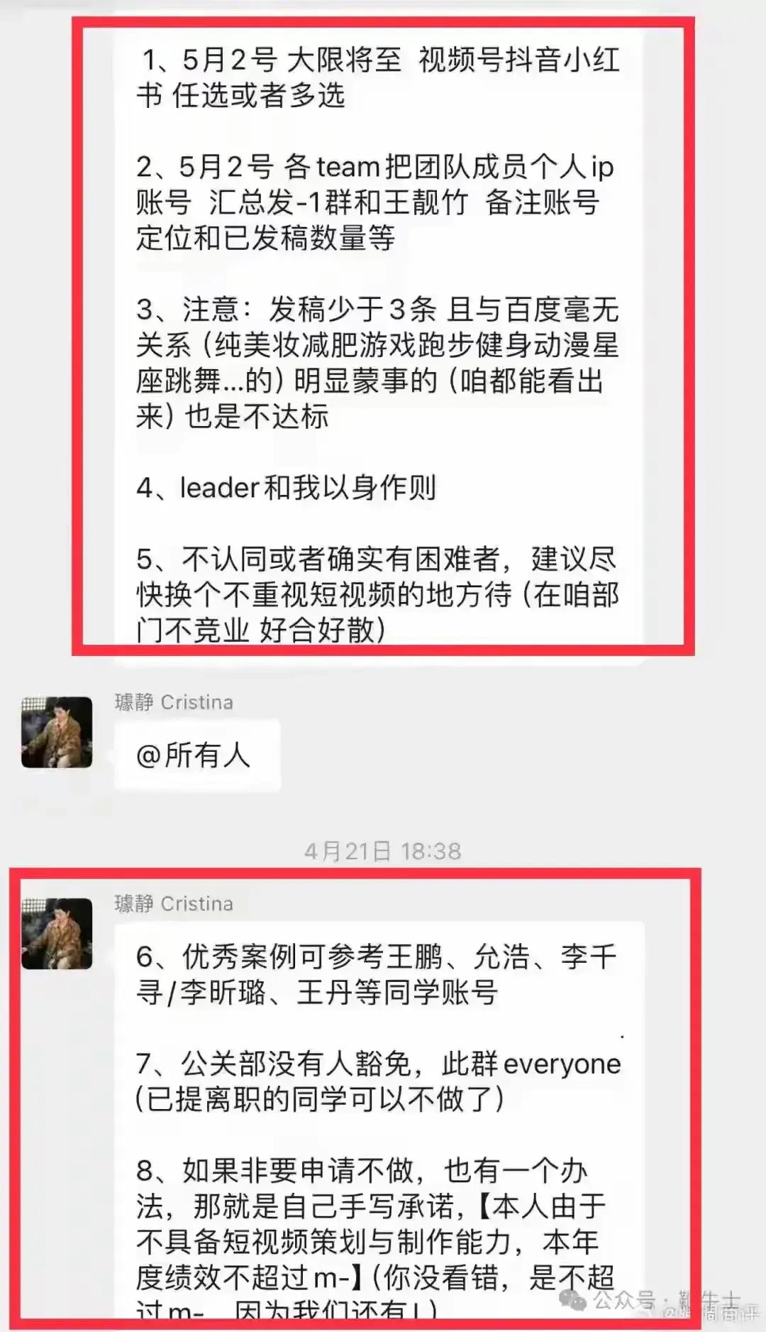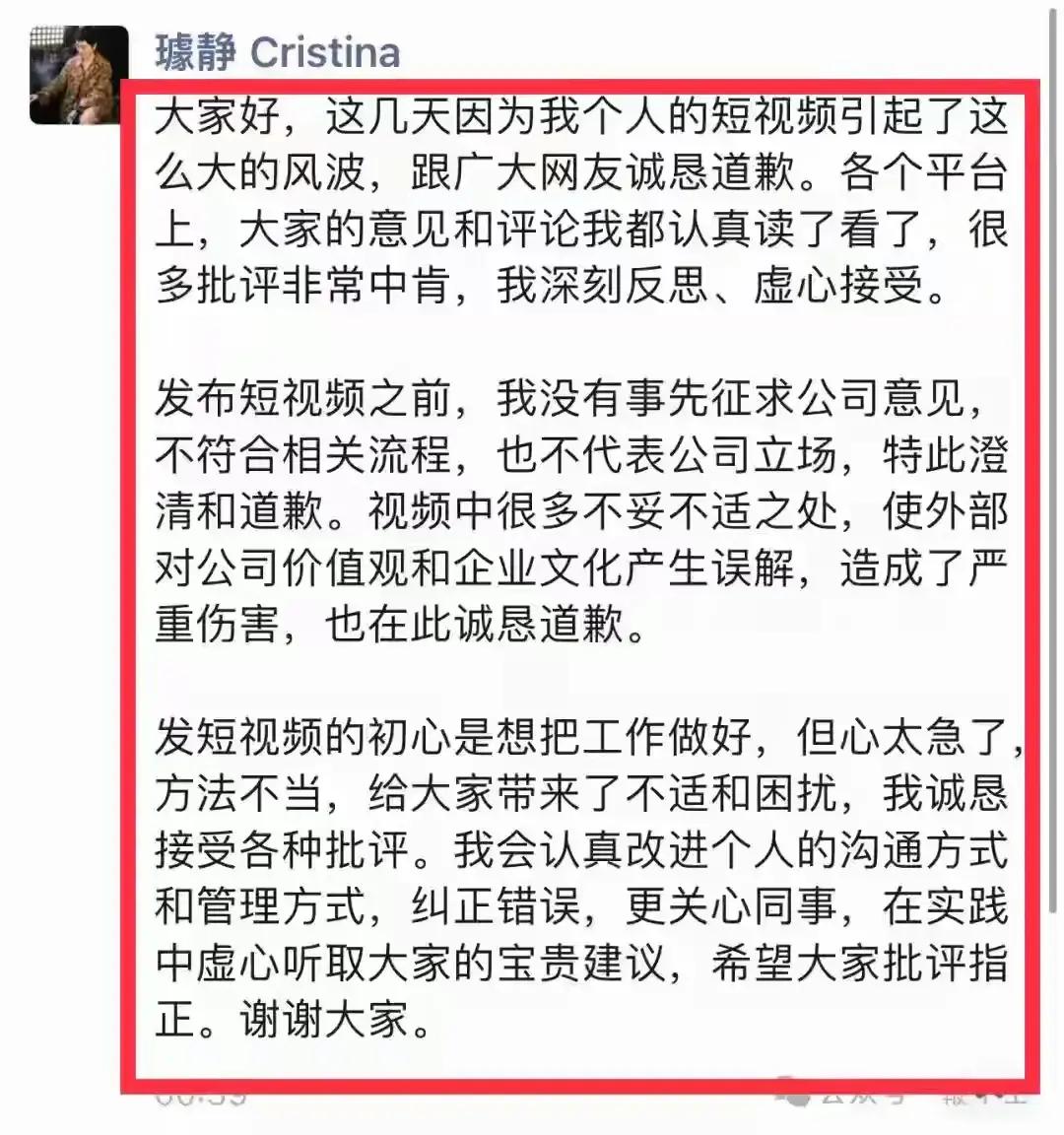 (七)璩靜做短視頻賬號栽跟斗,網友猜測2024年由於小米雷軍,到360的董事長周鴻禕一批互聯網大佬互聯網ip人設,作爲百度副總裁璩靜急於求成,還在公司內部羣訓話員工每人做一個視頻ip,不做就離職。