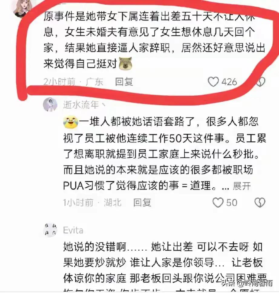(五)其中兩段話引起很大爭議:1、她說我爲什麼要考慮員工家庭,我又不是你婆婆,你們小情侶吵架跟我有什麼關係,如果你們分手離職我秒批,我要考慮的是員工能不能在她崗位上發揮作用,給我交付我要的結果,員工996、007拼命工作,不就是爲了家庭幸福生活嗎?這番話簡直就是現代女周扒皮。