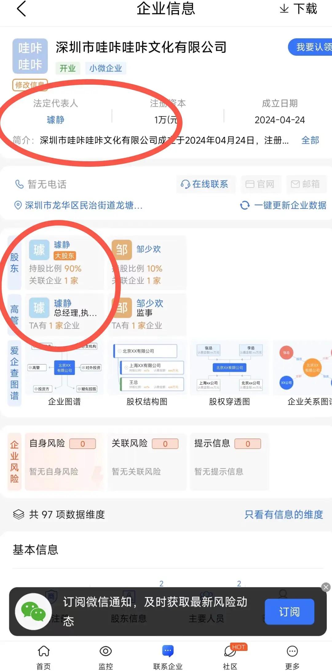 但是根據媒體報道,還有企查查顯示,璩靜4月24日就註冊了一個公司,小微企業,璩靜爲第一股東,法定代表人,不得不讓人聯想早有預謀。