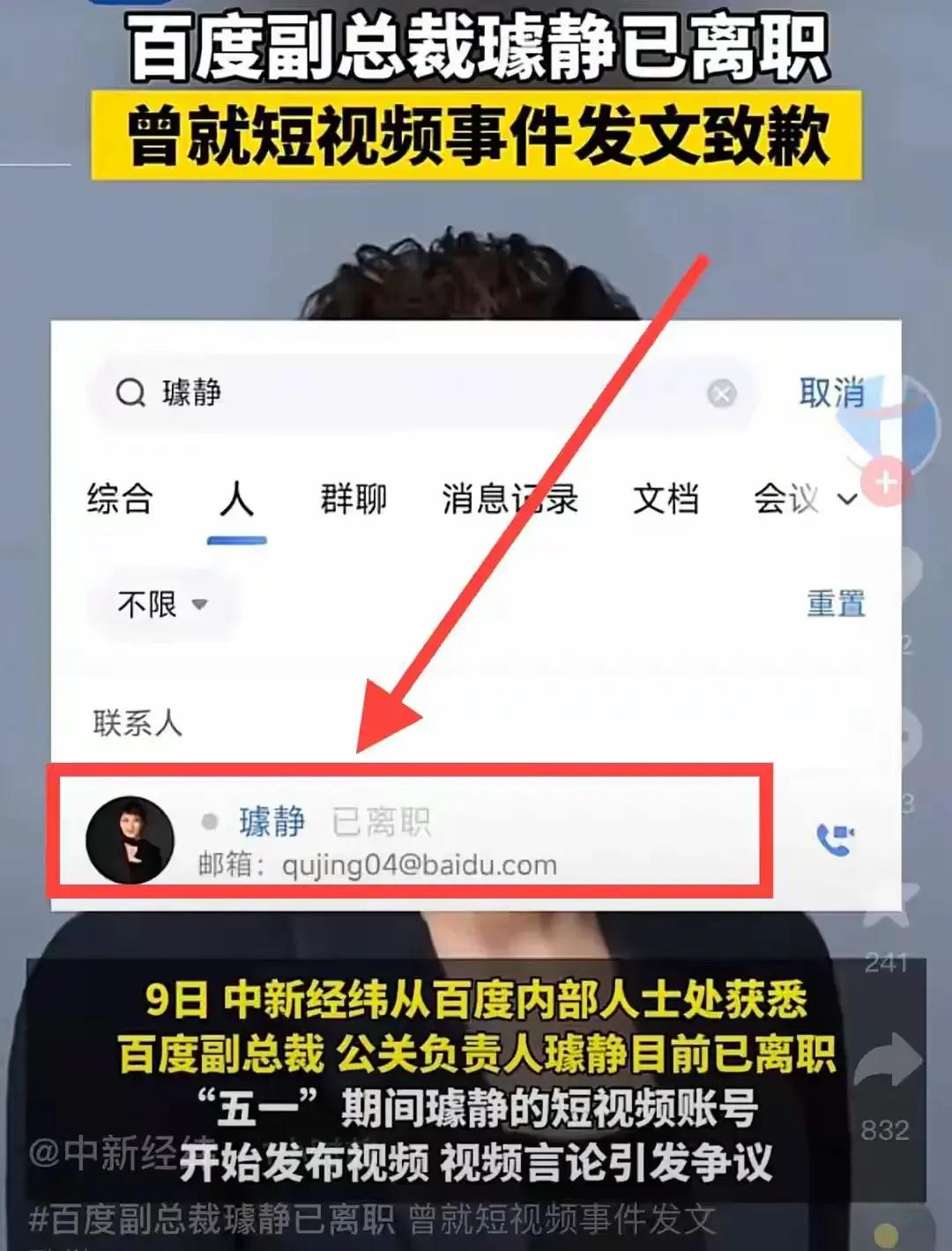 (十四)5月9日晚間多家媒體報道,並曬出截圖,璩靜郵箱後面顯示離職,璩靜在抖音上之前簡介爲(百度副總裁,如今也消除),百度百科上資料也顯示璩靜爲原來副總裁。
