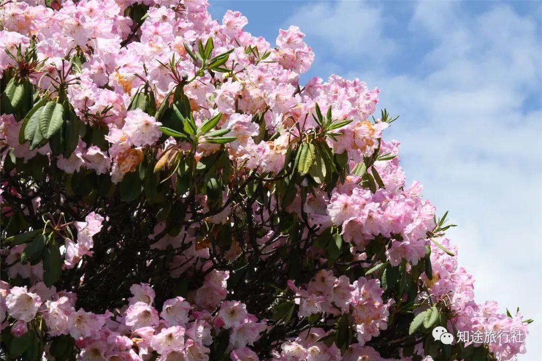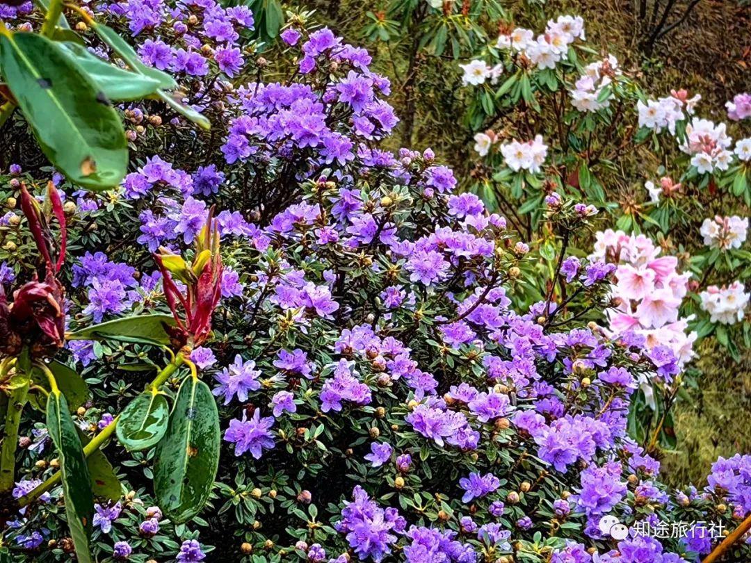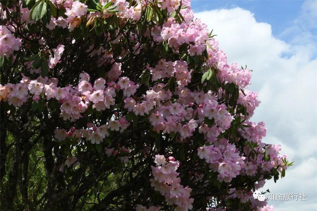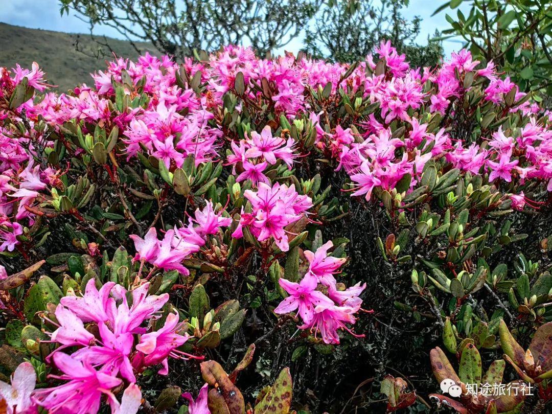 這裏的高山杜鵑,當地稱爲索瑪花,種類繁多,隨着山坡律動起伏,親眼所見才理解“百花齊放”這個詞的真正含義。很多高大的杜鵑樹密集分佈在山頭,這一樹、那一樹,奼紫嫣紅。