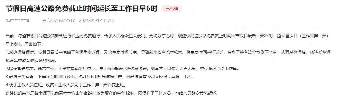 該網友在人民網“領導留言板”寫道,“當前,每逢節假日高速公路都會進行相應的免費通行,給予人民羣衆巨大便利。爲將好事辦好,現建議高速公路免費截止時間由節假日最後一天24時,延長至次日(工作日第一天)早上6時。”