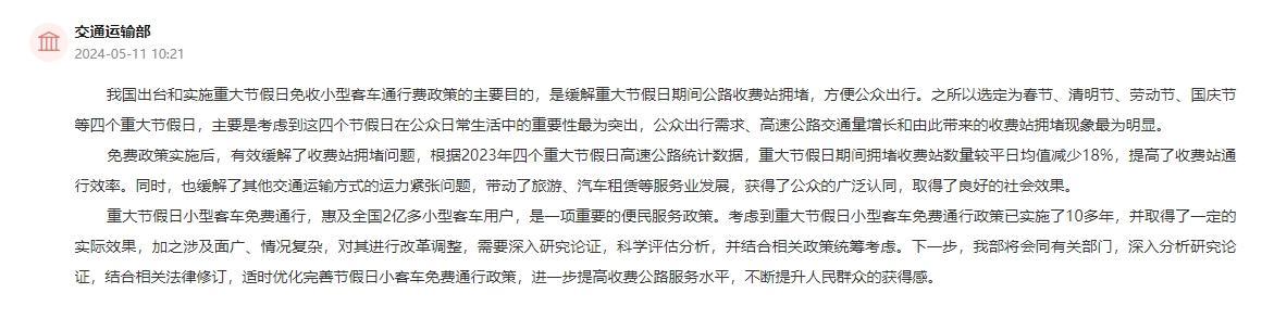 近日,交通運輸部答覆了一則網友關於“節假日高速公路免費時間延長至早上6時”的建議。
