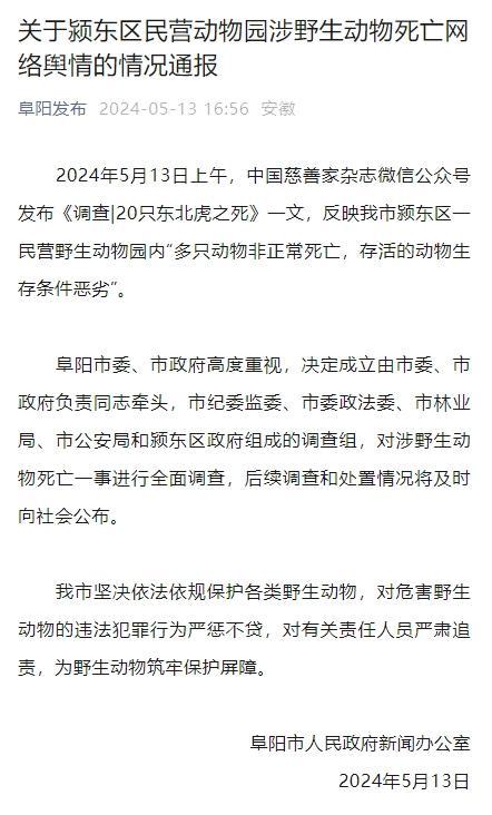 5月13日上午,中國慈善家雜誌微信公衆號發佈《調查|20只東北虎之死》一文。文中顯示,阜陽野生動物園在未取得人工繁殖許可證的情況下,違法展示展演、人工繁殖國家一級保護動物東北虎。受動物園經營權糾紛等的影響,園中大量野生動物死亡,其中包括20只東北虎、2只非洲獅、3頭長頸鹿等珍貴野生動物。