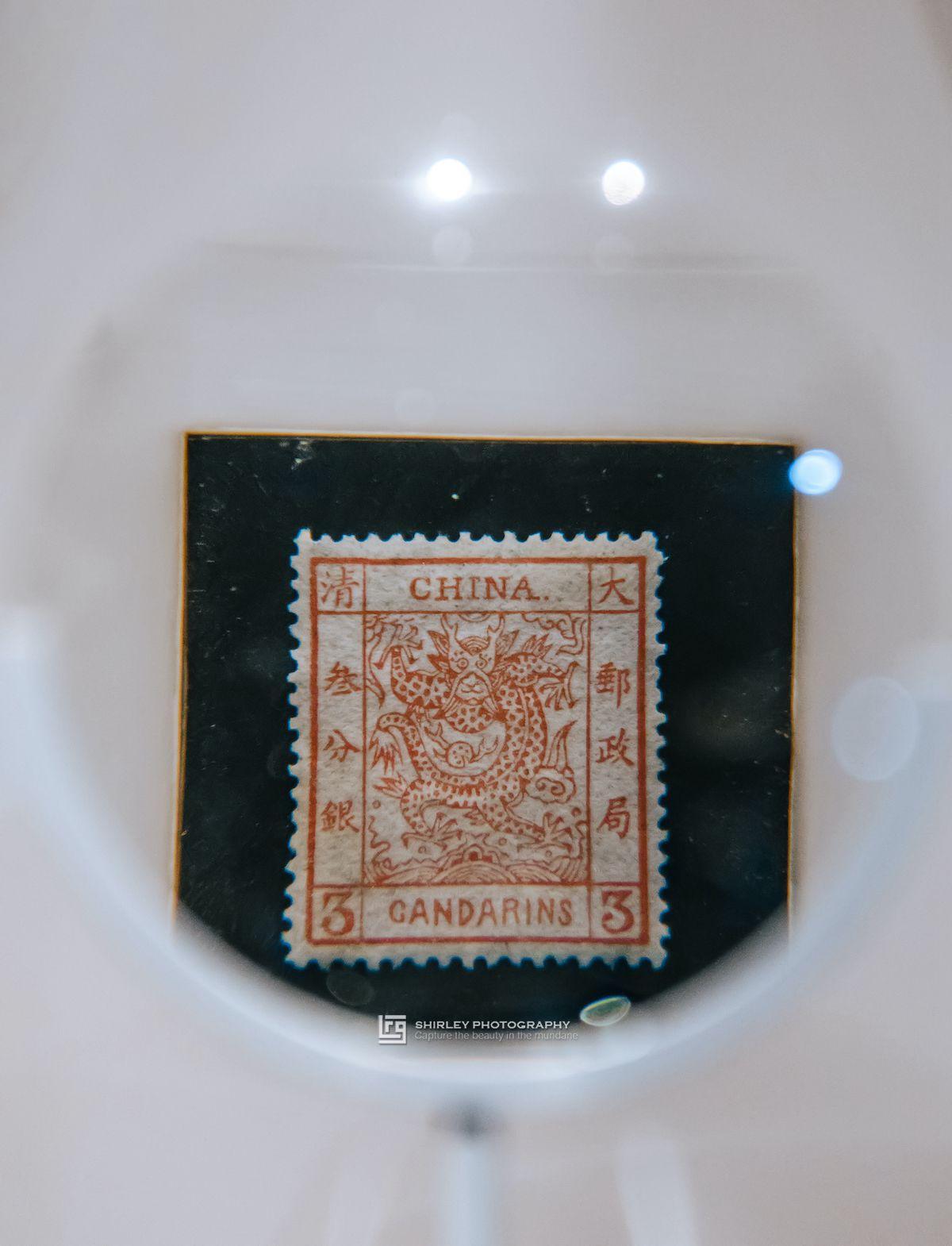 不少人圍着拍的大龍郵票,這是1878年清政府海關印發的、我國曆史上第一套郵票。集郵界習慣稱之爲“海關大龍”,被國際郵政局長協會列入73種世界最早郵票之一。票面圖案是五爪龍配以雲崖海水紋,極具清朝皇室特色,小小一張卻十分精美。