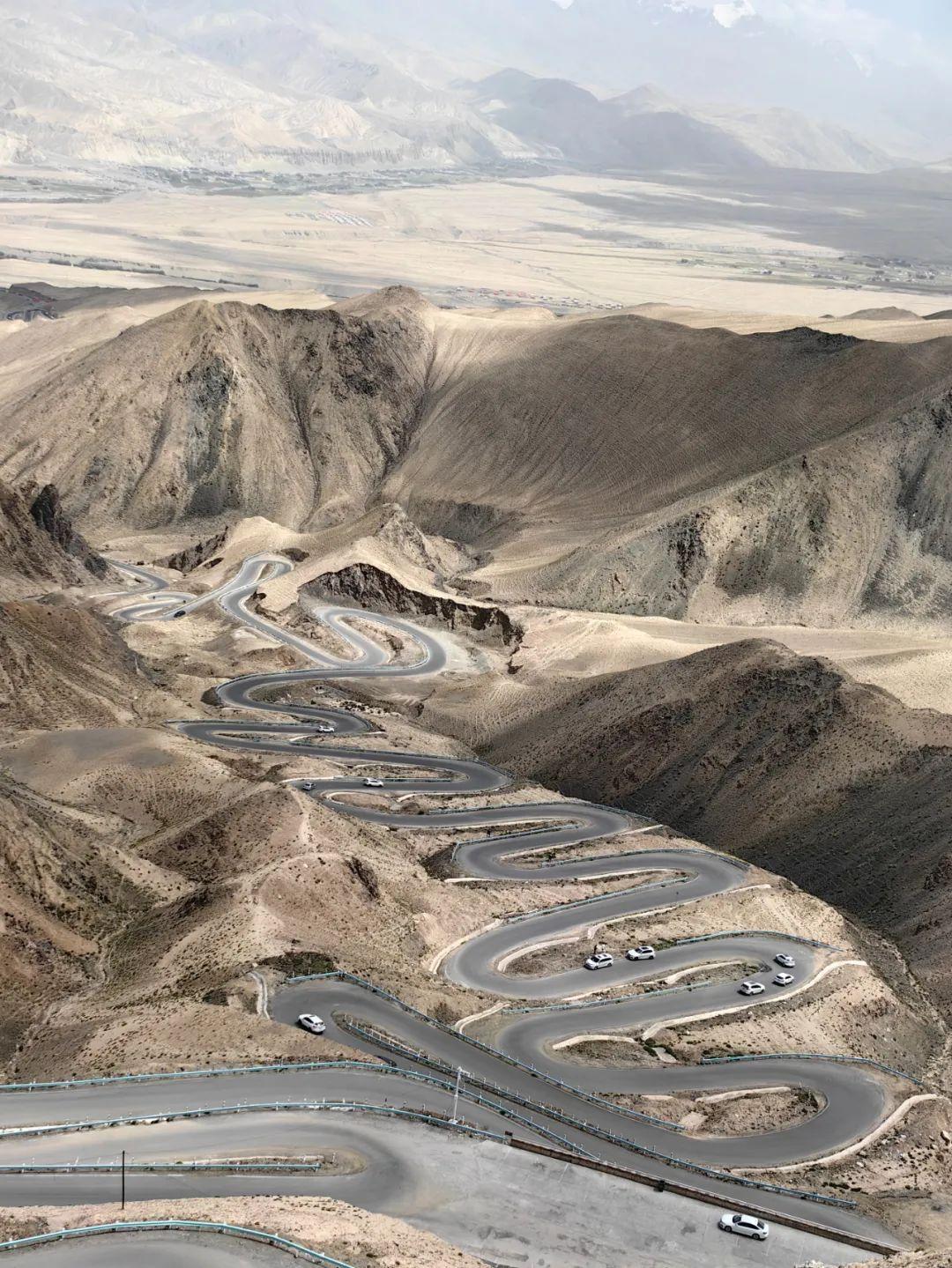 站在山坡上俯瞰,黑色的盤山公路如臥龍般盤繞山脊,連續360度的髮卡彎直通山頂,十分震撼。感受“走過此生所有的彎路,從此人生是坦途”的意境。