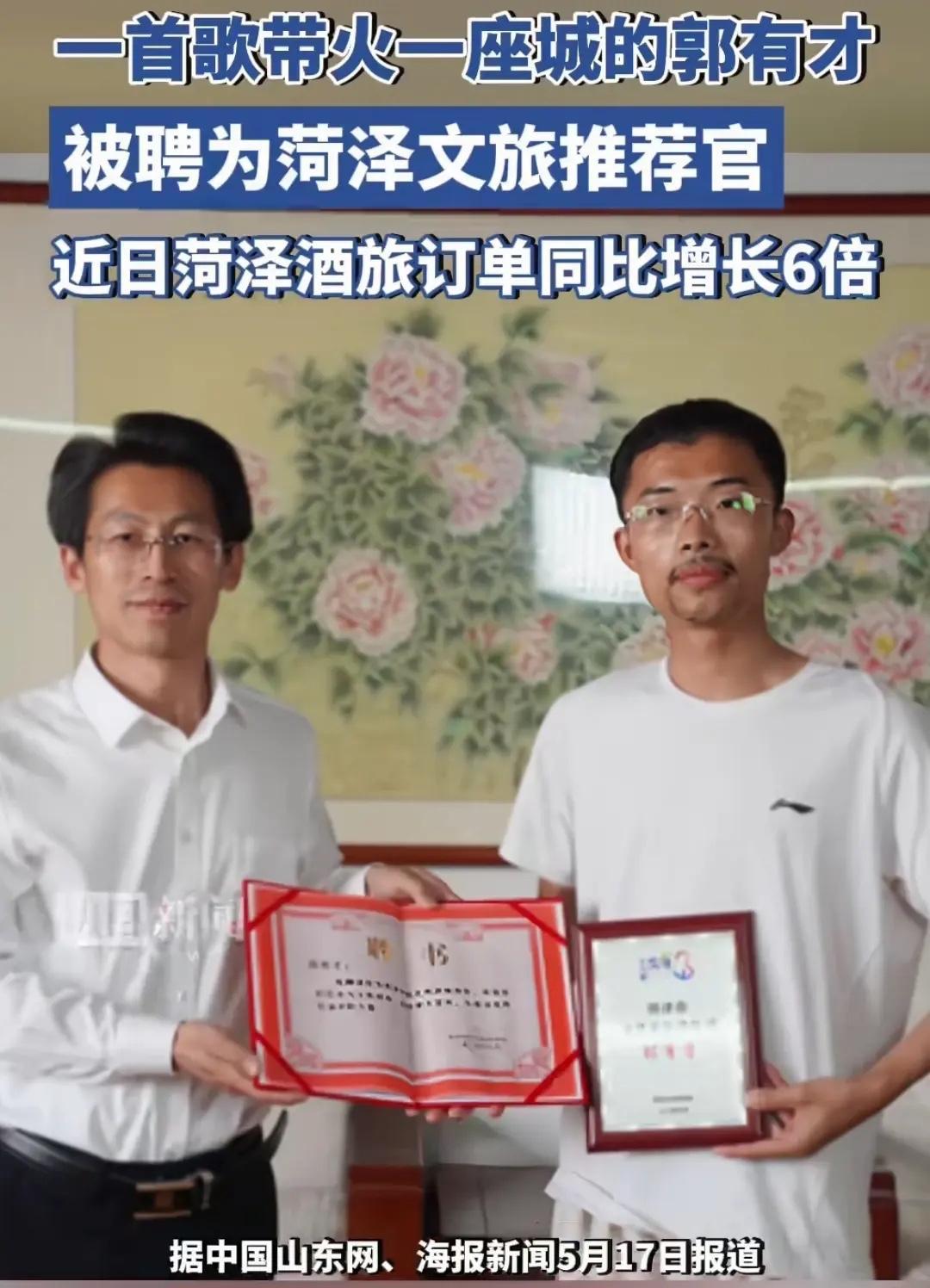 郭有才熱度太高了,隨着5月19日中國旅遊日臨近,歌有才被菏澤文旅聘請爲菏澤旅遊形象推薦官,郭有才表示歡迎大家到菏澤來玩,欣賞牡丹,品嚐美食燒烤,聽他唱諾言。