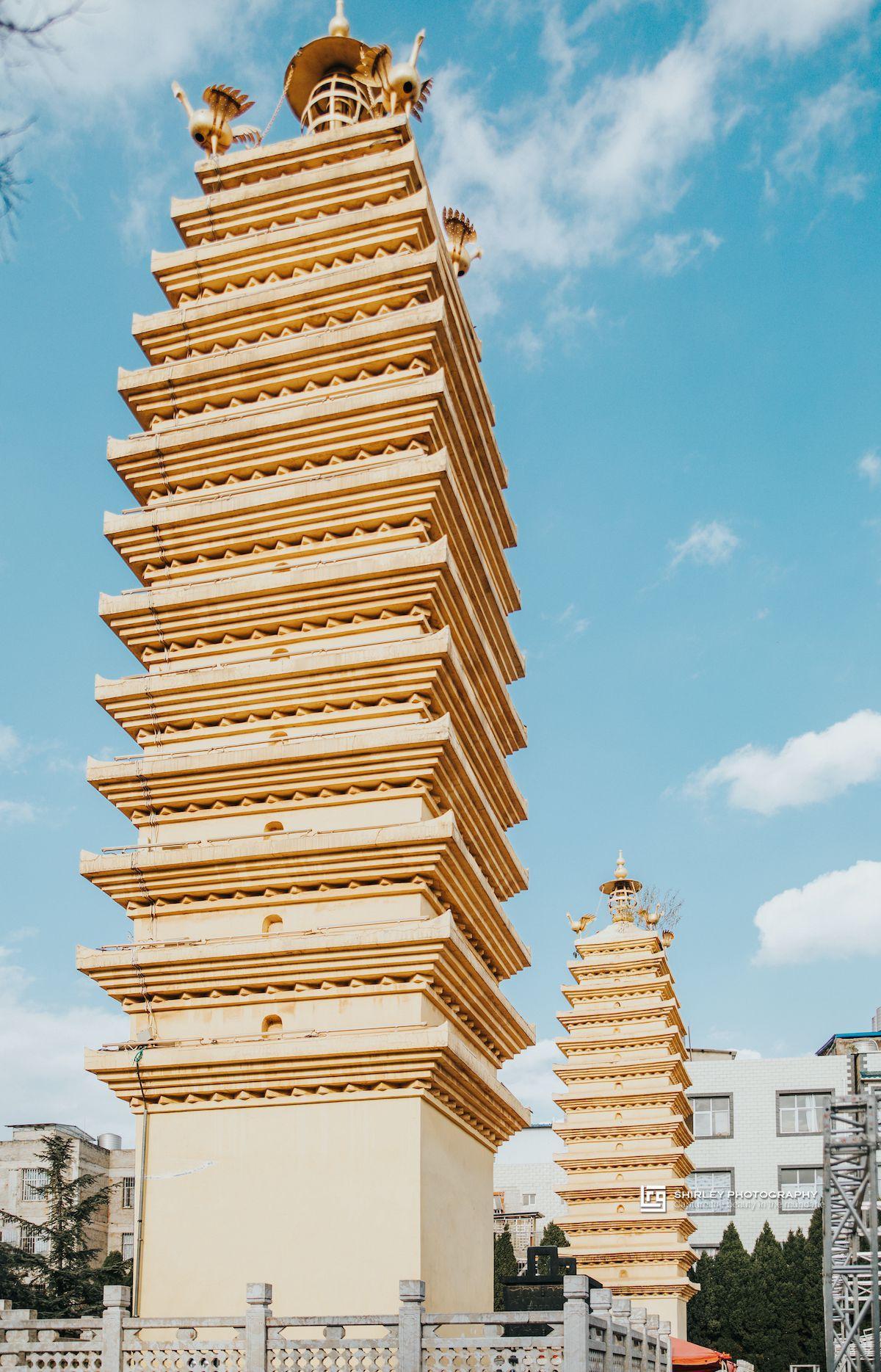 另一看點妙湛寺雙塔同樣位於廣場上,始建於元代,爲13層密檐實心磚塔,一東一西,相距15米。兩塔通體淡黃色。其中,東塔爲元代古蹟,西塔曾毀於地震,現存爲2003年重建之物。塔頂四角各立一隻迦樓羅,俗稱“金雞”,故此塔又稱“金雞塔”。