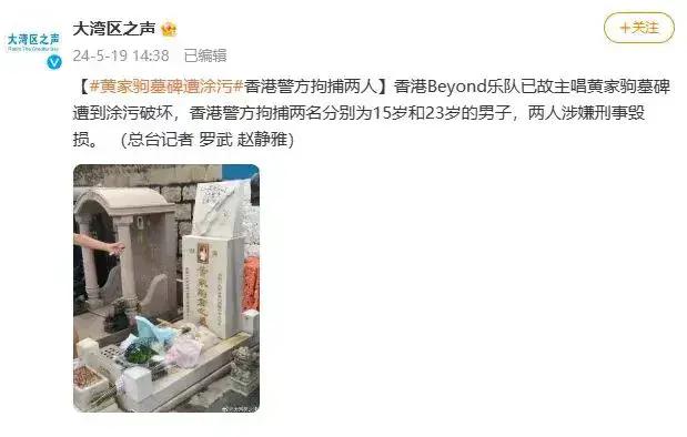 據一條視頻在網絡上熱傳,香港知名Beyond樂隊主唱黃家駒墓碑被人砸和塗鴉,據權威媒體可靠消息是發生在2024年5月19日,視頻中一名年輕男子講着粵語一邊砸壞黃家駒墓碑上的照片,用筆塗鴉、用腳踩、還很得意樣子,嘴裏粵語不知道是不是帶有侮辱詞彙,咱聽不懂粵語,看了就讓人心碎、據說目前兩名被香港官方逮捕,犯罪分子分別是一名15歲和23歲男子,兩人合夥,一人負責砸,一人負責拍照,這些人都是故意破壞。