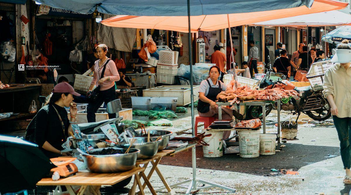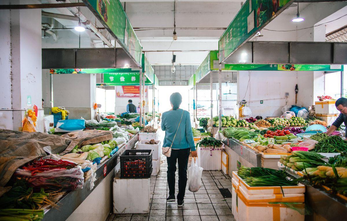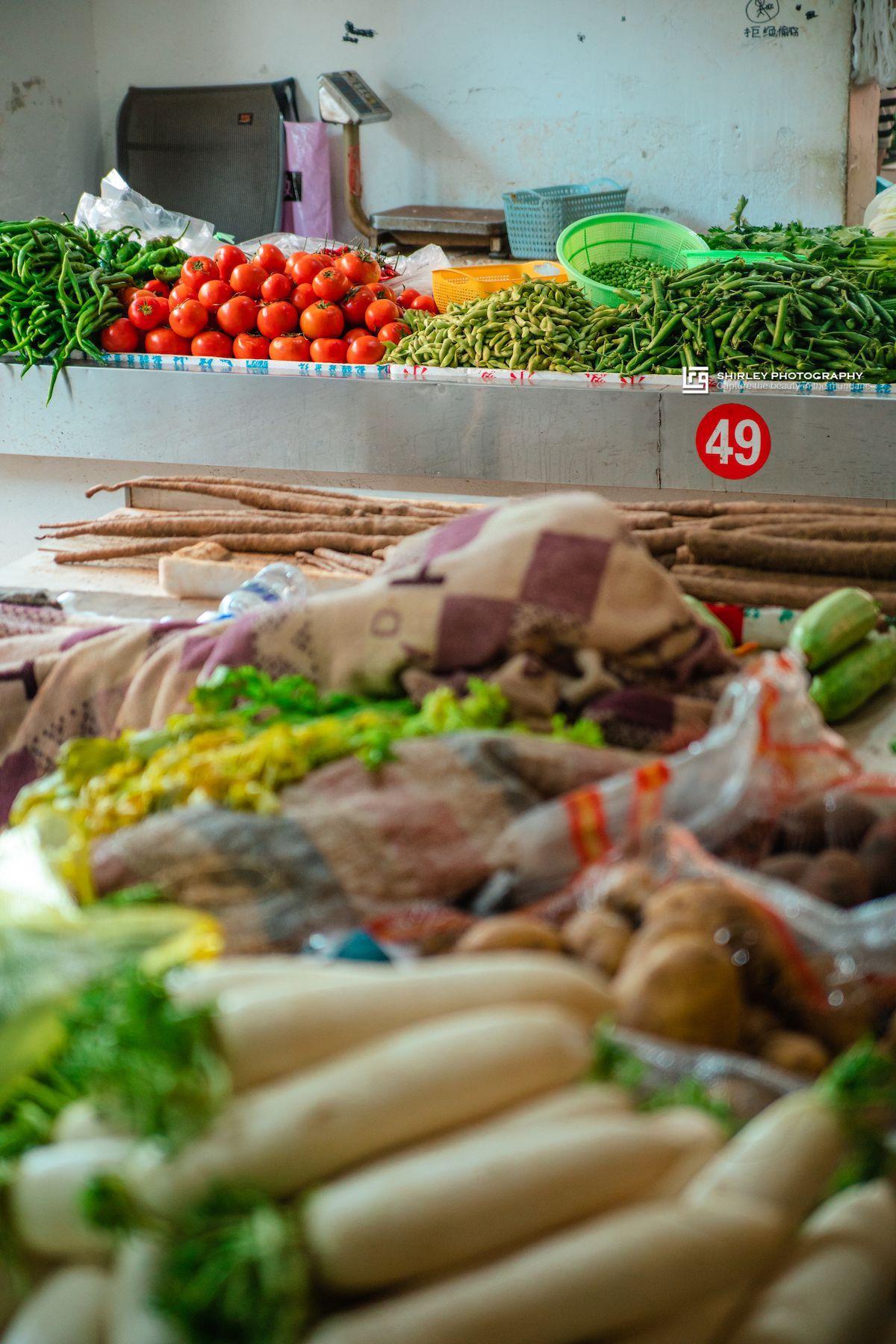 室內部分就是傳統的菜場了,裏面沒什麼遊客,安靜了許多,進到這一區域的大多是在這常住的人。只見新鮮的蔬菜瓜果、肉類整整齊齊地碼放在臺上,帶着田野的清新和自然的香氣。
