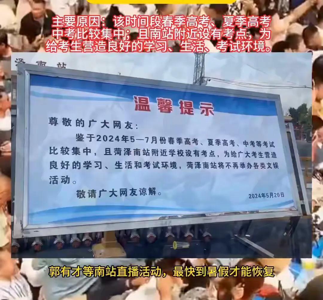 5月21日菏澤郭有才被舉報衝上熱搜,一張圖落款爲5月20號,說近期菏澤周邊學生考試,5至7月暫停直播,菏澤南站暫停直播,5月21晚筆者搜索當天晚上郭有才燒烤抖音上未出現直播,媒體發文必須割掉危害孩子這顆全民網紅毒瘤。