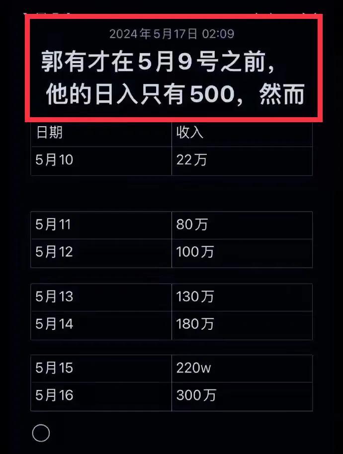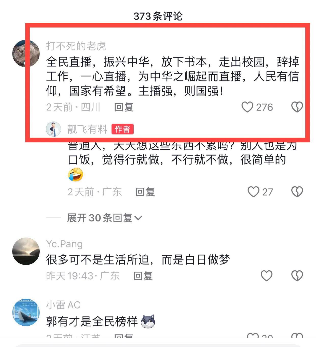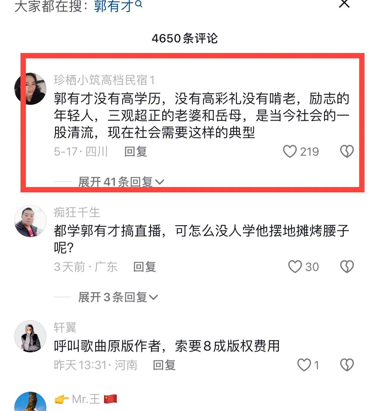 5月20日郭有才面對他人生中兩位重要貴人現身直播現場(女友蘇暢和丈母孃)郭有才現場向女友求婚成功,筆者點進去直播間看了一會,郭有才說自己沒什麼文化,唱的歌也五音不全,現在唱的是感情,以後會請名師指導,接受專業訓練,給粉絲帶來專業唱功,郭有才直播間一天禮物刷不停,嘉年華刷不停,網友扒他直播數據,據說日入百萬,因爲他一個草根,實力與收入不匹配,引人眼紅不滿,你想教育那麼內卷,養一個孩子讀書幾十年出來只能送外賣,郭有才輕輕鬆鬆就分到了大蛋糕,那些拼盡全力養雞娃的人誰見了想得開。