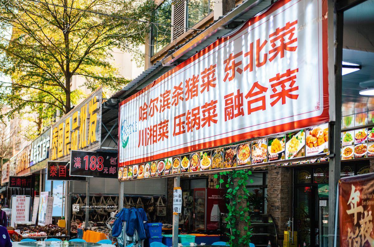 靠近集市入口處,是餐廳聚集的區域。街上能喫到各種諸如鐵鍋燉、殺豬菜、東北水餃、東北燒烤這樣的地道東北美味。連東北的菜量這裏都繼承了下來,我們四個人點了三個菜,最後沒一個喫完的。春節時穿着短袖坐在戶外喫正宗東北菜,感覺回到了夏天的哈爾濱。