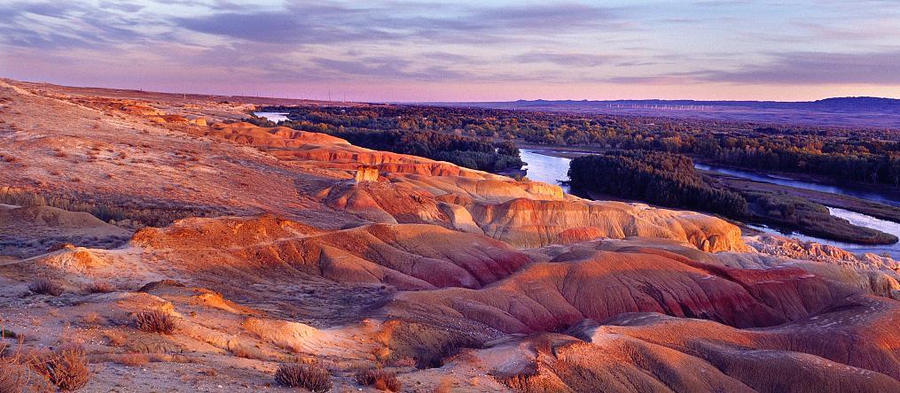 5、五彩灘:雅丹地貌與額爾齊斯河相映成趣,色彩斑斕,由黃,紫綠顏色構成,類似於甘肅張掖丹霞地貌,但是五彩灘更是美不勝收,略勝張掖丹霞一籌,因此被稱爲天下第一灘。