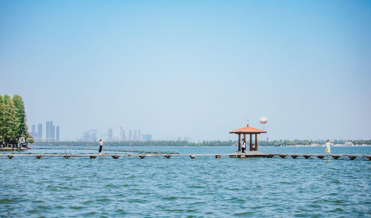 走在聽濤泳場的棧道上,能夠收穫如細膩絲綢般鋪展的碧綠湖面,湖水清澈湛藍得像天空之境。在棧道盡頭,眺望東湖無垠,難怪在社交平臺上,網友們稱其爲“武漢之海”。在晴好天氣的襯托下,水天一色的東湖真的會隱隱顯現出壯闊大海的氣派來。
