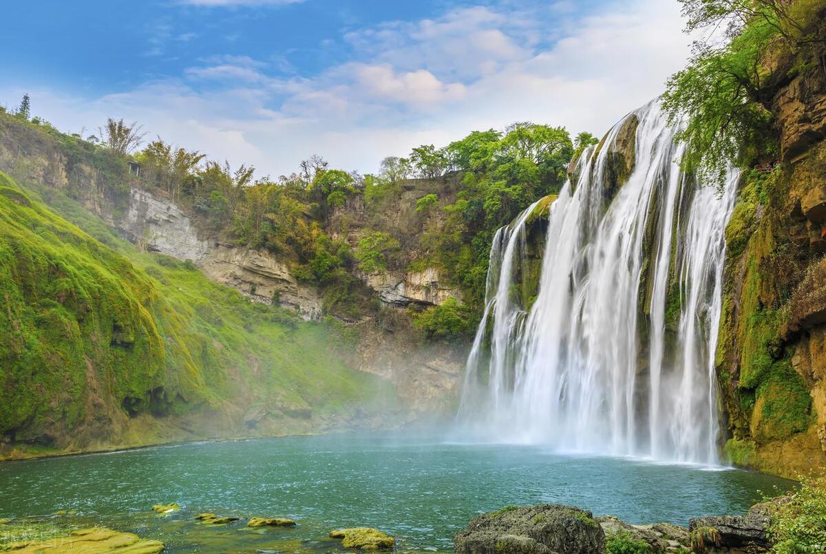 壯,闊,大,在世界偌多知名大瀑布中,不足爲奇。而像黃果樹瀑布這樣,能從上、下、前、後、左、右各方位去觀賞的瀑布就比較少見了。最妙的是,瀑布後的山體上,是一孔天然掏空的幽邃石洞;臨水的洞壁上,有二三豁口,開窗般,框住了瀑布的一截兒。你探頭就能觸着瀑布,伸手就能摸到瀑布,鑽入瀑布的肚子,就能感受它的轟轟心跳。