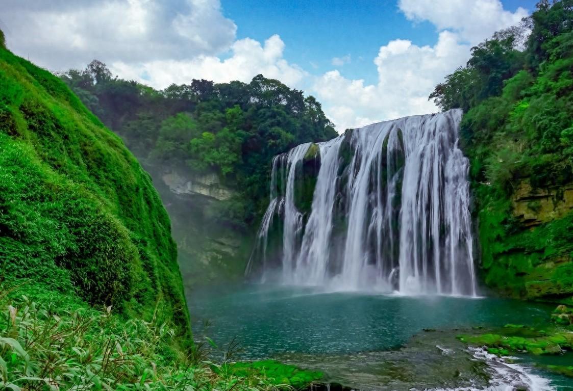 那天抵達黃果樹景區,已近正午時分。從明亮的太陽光下忽然走入林蔭棧道,似是走進了晦暗中。綠蔥蔥的樹蔭裏,人像一幢幢綠影子躍動在山間石徑上。走過一折又一折後,終於在石柱、石筍交錯的縫隙中,在茂密竹叢、榕樹、銀杏樹、構樹以及寬大芭蕉葉的留白處,一小片飛瀑亮亮閃出,照亮了我們的眼睛。它被翠綠的背景框着,被藍天上的雲朵襯着,安靜而悠閒。