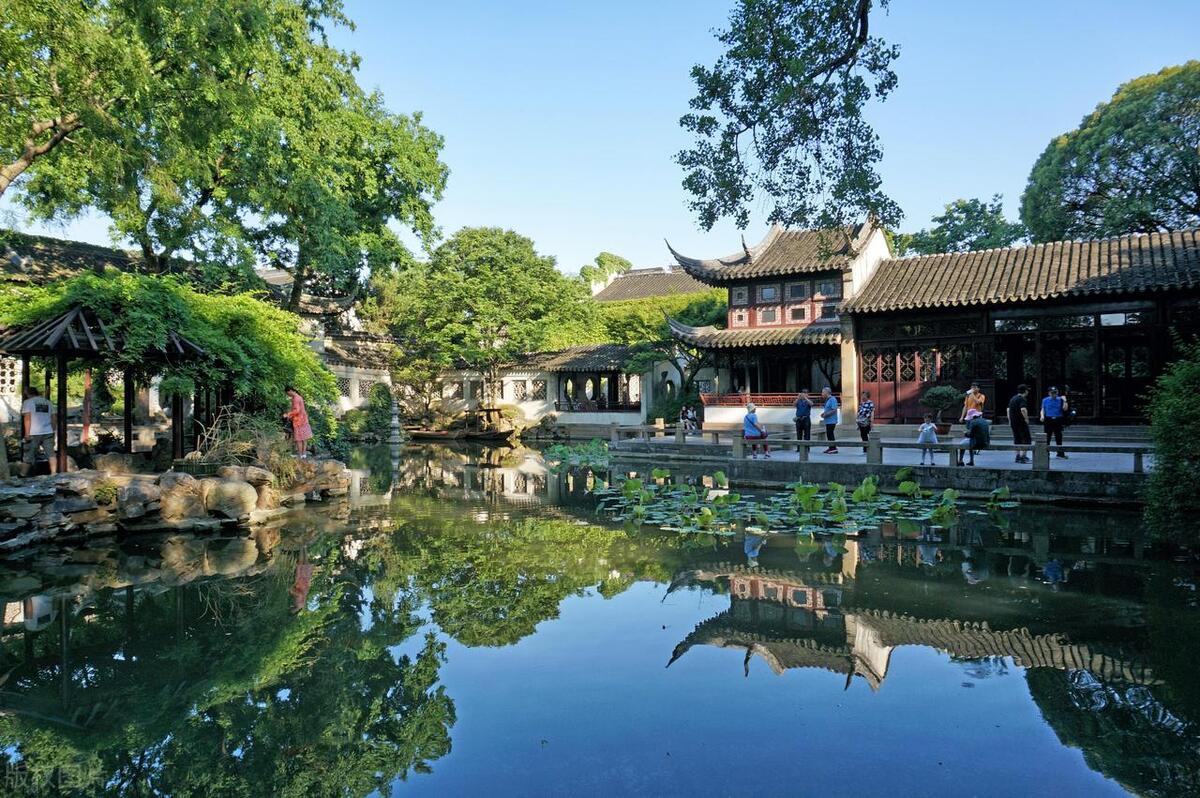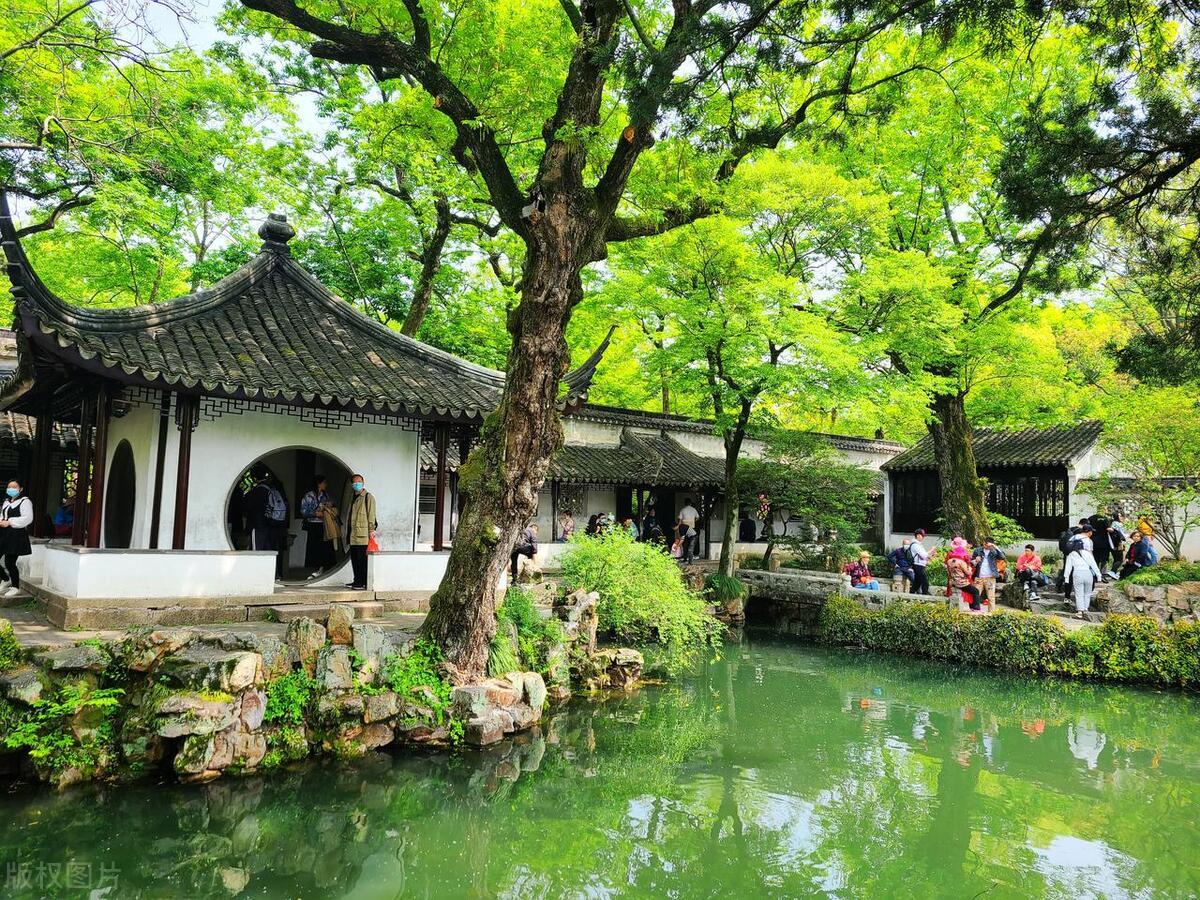 拙政園是蘇州最大的園林,入園即見一泓粼粼清水和一片茵茵草地,曠朗中,點綴着三兩亭閣。寸土寸金之地,這份開闊彌足珍貴。