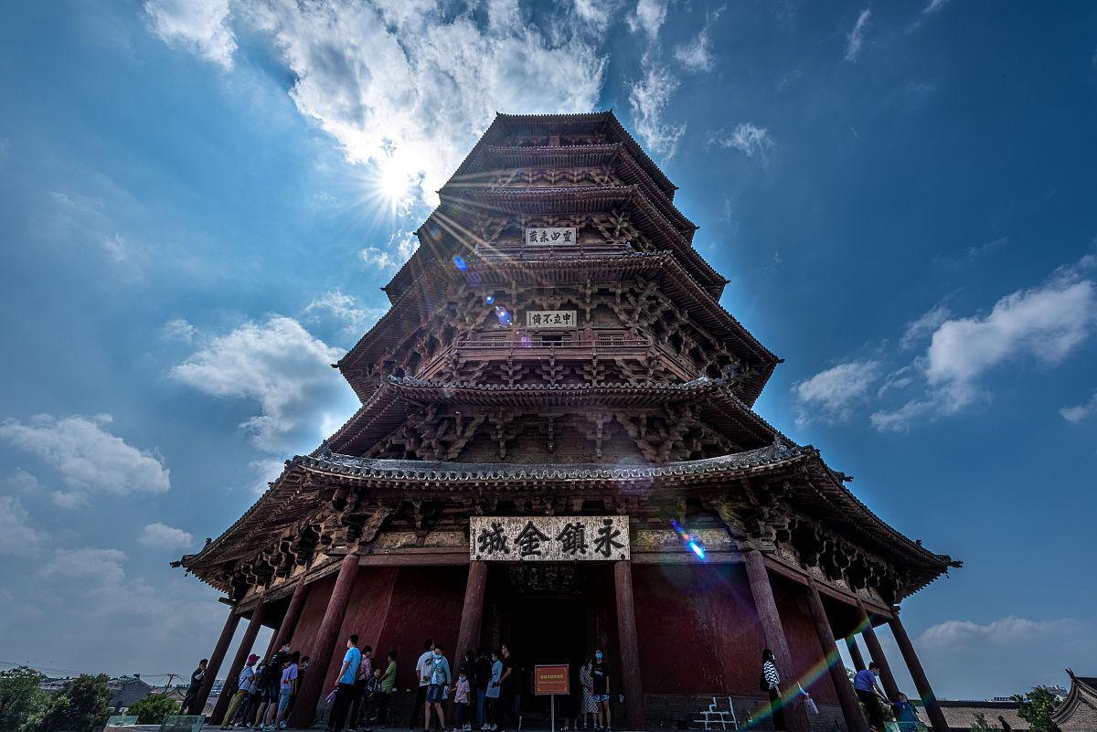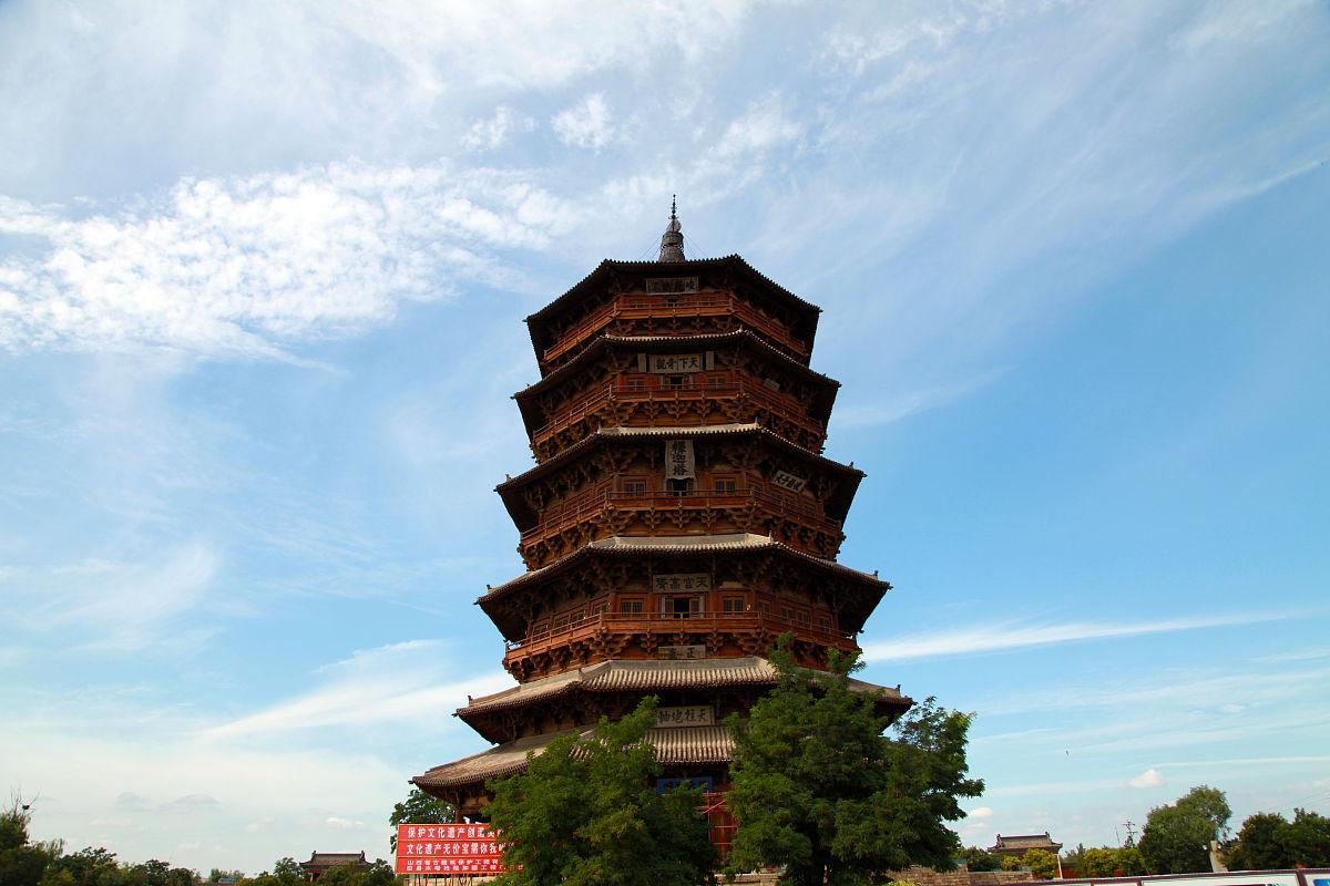 5. 應縣木塔:世界上現存最高、最古老的純木結構樓閣式建築。可以媲美法國的埃菲爾鐵塔,應縣木塔位於山西省朔州市應縣,是世界上現存最古老、最高大的木塔。這座木塔建於遼代,高達 67.31 米,塔身採用榫卯結構,沒有使用一顆鐵釘,展現了中國古代建築的高超技藝。