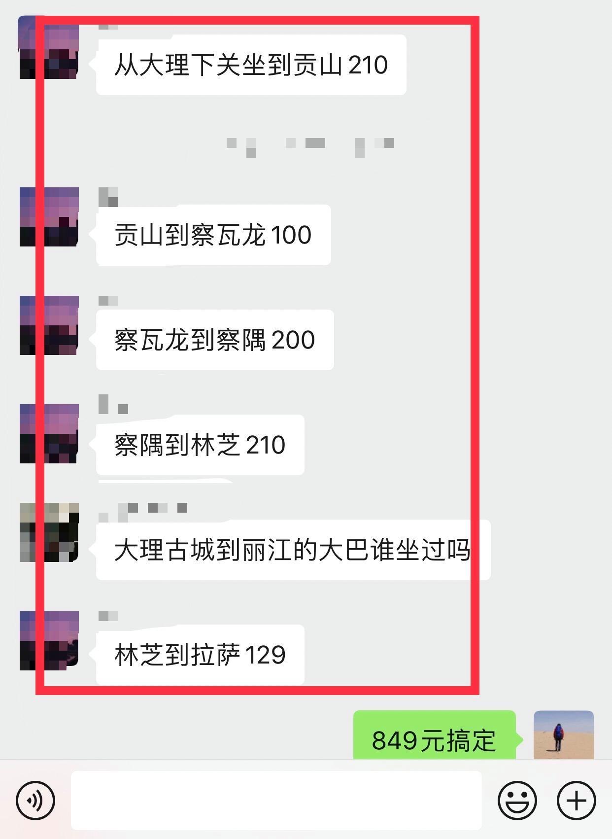 有人算了一筆賬自己坐車去拉薩,從大理下關坐到貢山210元,貢山到察瓦龍100元,察瓦龍到察隅200元,察隅到林芝210元,林芝到拉薩129元,自己一站一站短途坐車全程只需要花費849元搞定。