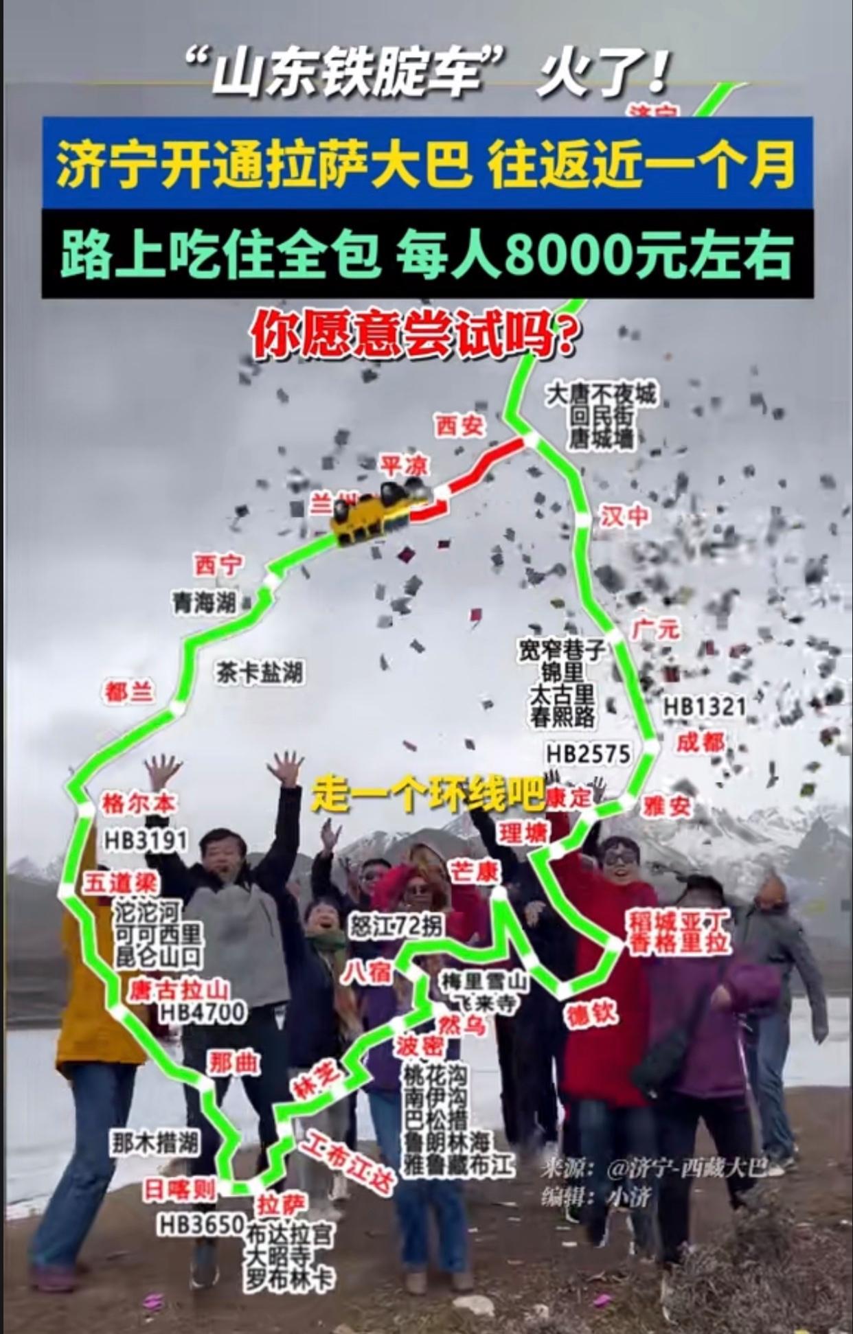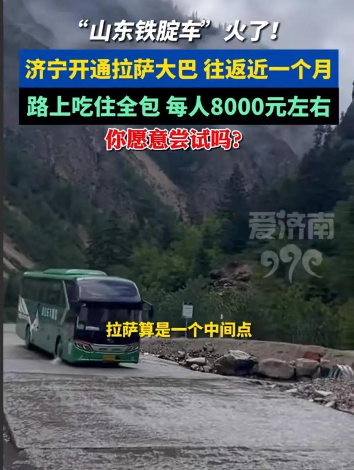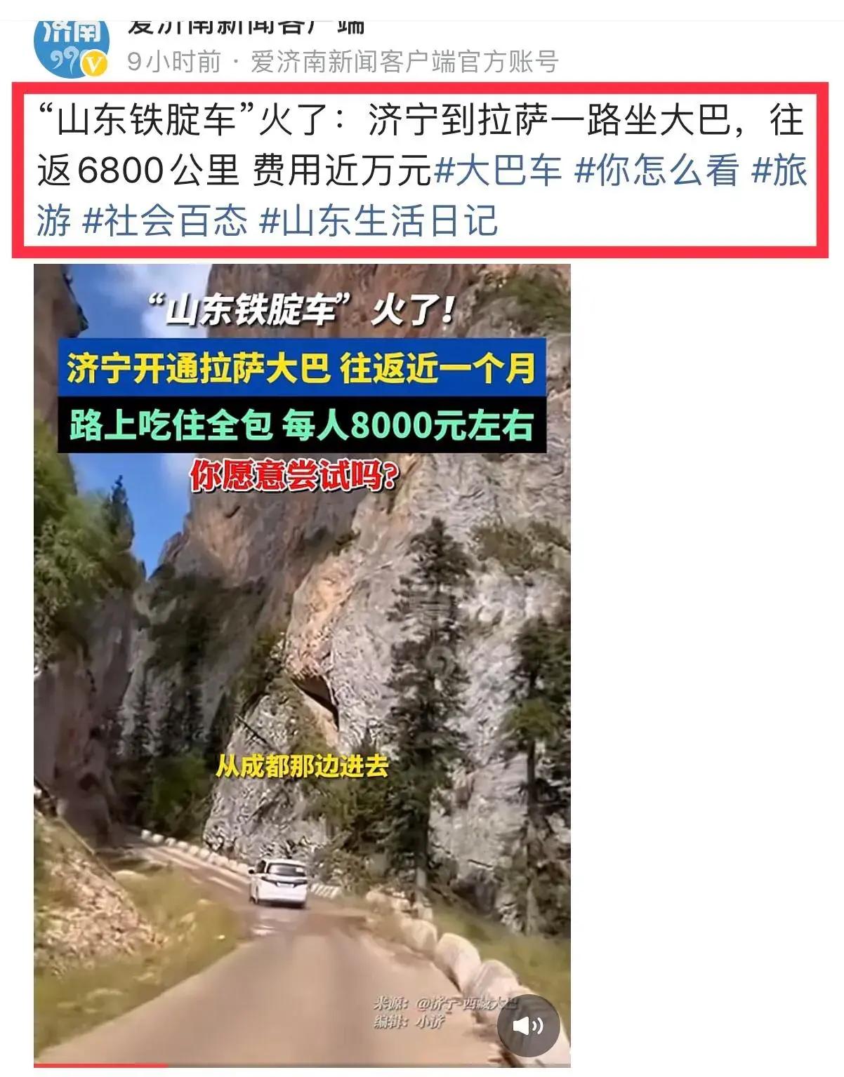 最近山東濟寧至拉薩一輛旅遊大巴車走紅,原因是他們這輛車屬於一家汽車服務公司專注這類定向旅遊,從山東濟寧發車去拉薩,全程6800公里(包來回),車上配備航空座椅,空間大,非常舒適,從濟寧發車一路邊走邊玩,從318進藏,到達拉薩後一路走青藏線甘肅到西安返回濟寧,這趟行程主要遊客來自山東濟寧本地人,遊客年齡多爲中老年人,50多歲、60多歲中老年)車上大約坐30多人,每人費用8000元左右,包遊客喫住,全程就是坐這輛大巴車,坐火車去拉薩也就是四五十個小時,但是這個大巴車遊客這趟旅遊時間需要坐一個月,因爲一直坐,網友戲稱爲最牛(鐵腚大巴)。