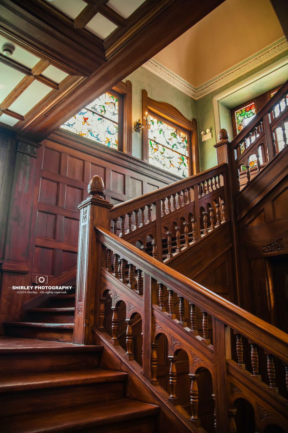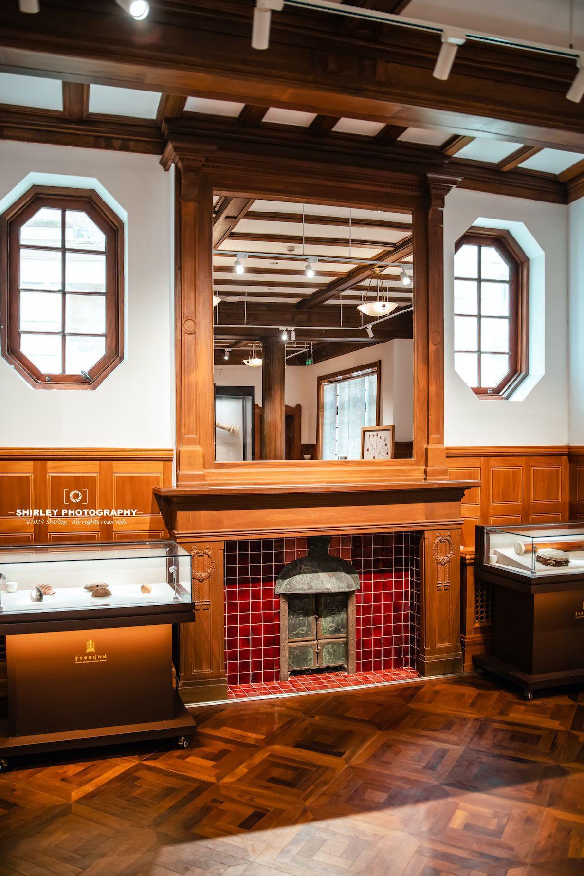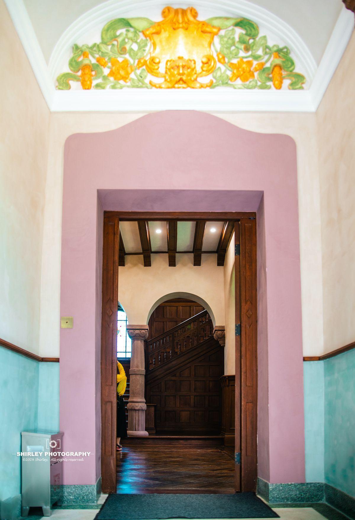 最矚目的就是在通往二樓的樓梯,一旁有4扇彩繪玻璃花窗,透出斑斕的光影,上面多爲果木花鳥圖案。不同的房間裏,造型各異的壁爐、花磚、牆紙、吊燈令人目不暇接,彷彿到了民國劇的拍攝片場。