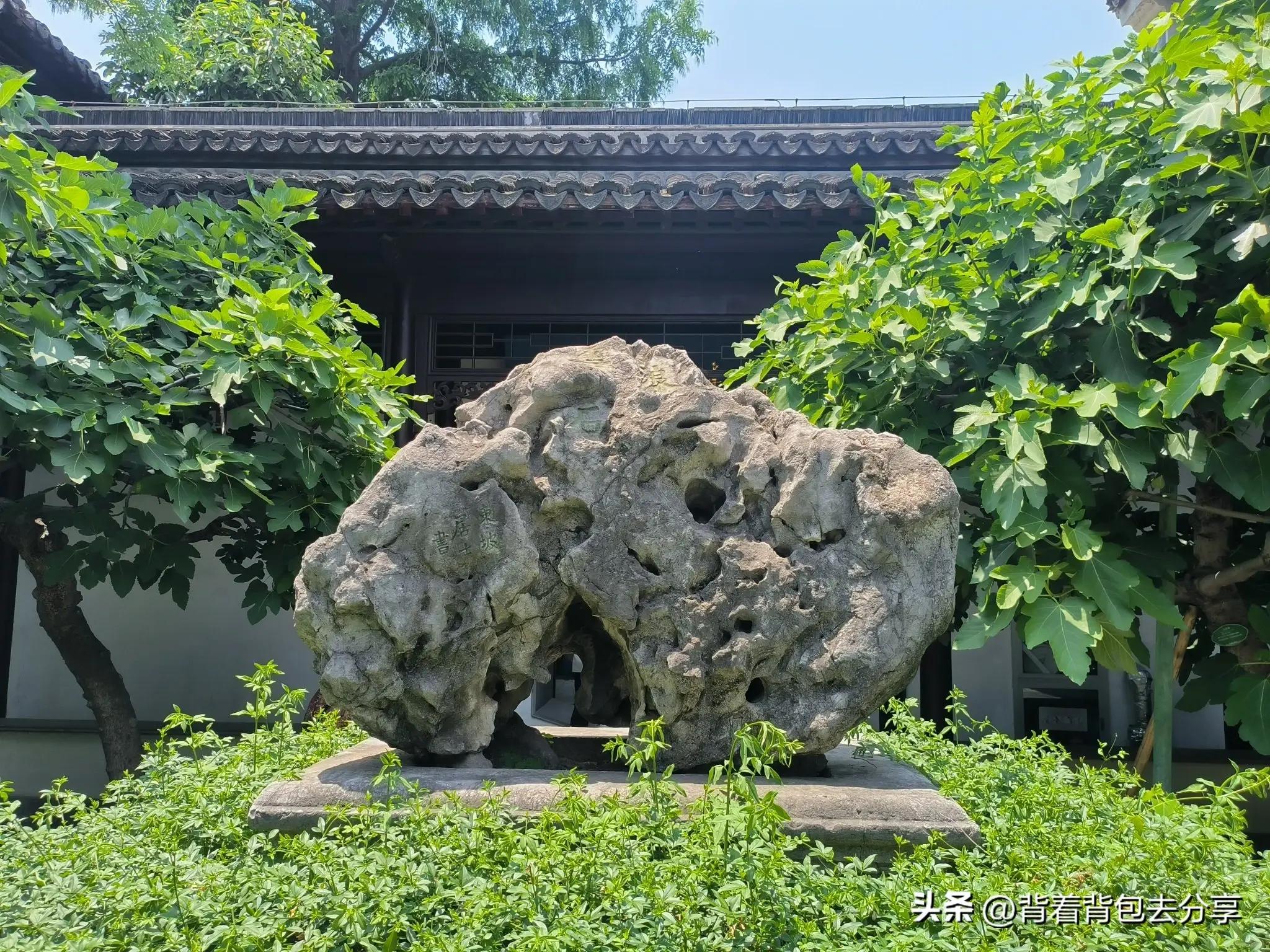 雪浪石,在景徐堂”前,與其漢白玉石盆底座皆爲明代王府遺物,石上隸書的雪浪石三字,呈明代書風,此雪浪石與蘇東坡傳世於河北定州的雪浪石並無關係,但有人盜名人之名以圖欺世,在石上題刻了筆法拙劣的東坡居士書