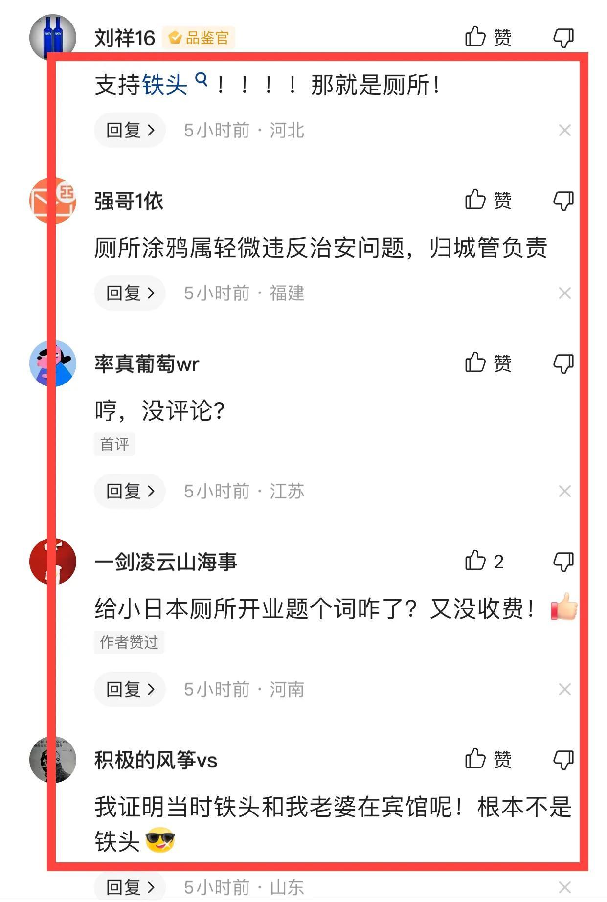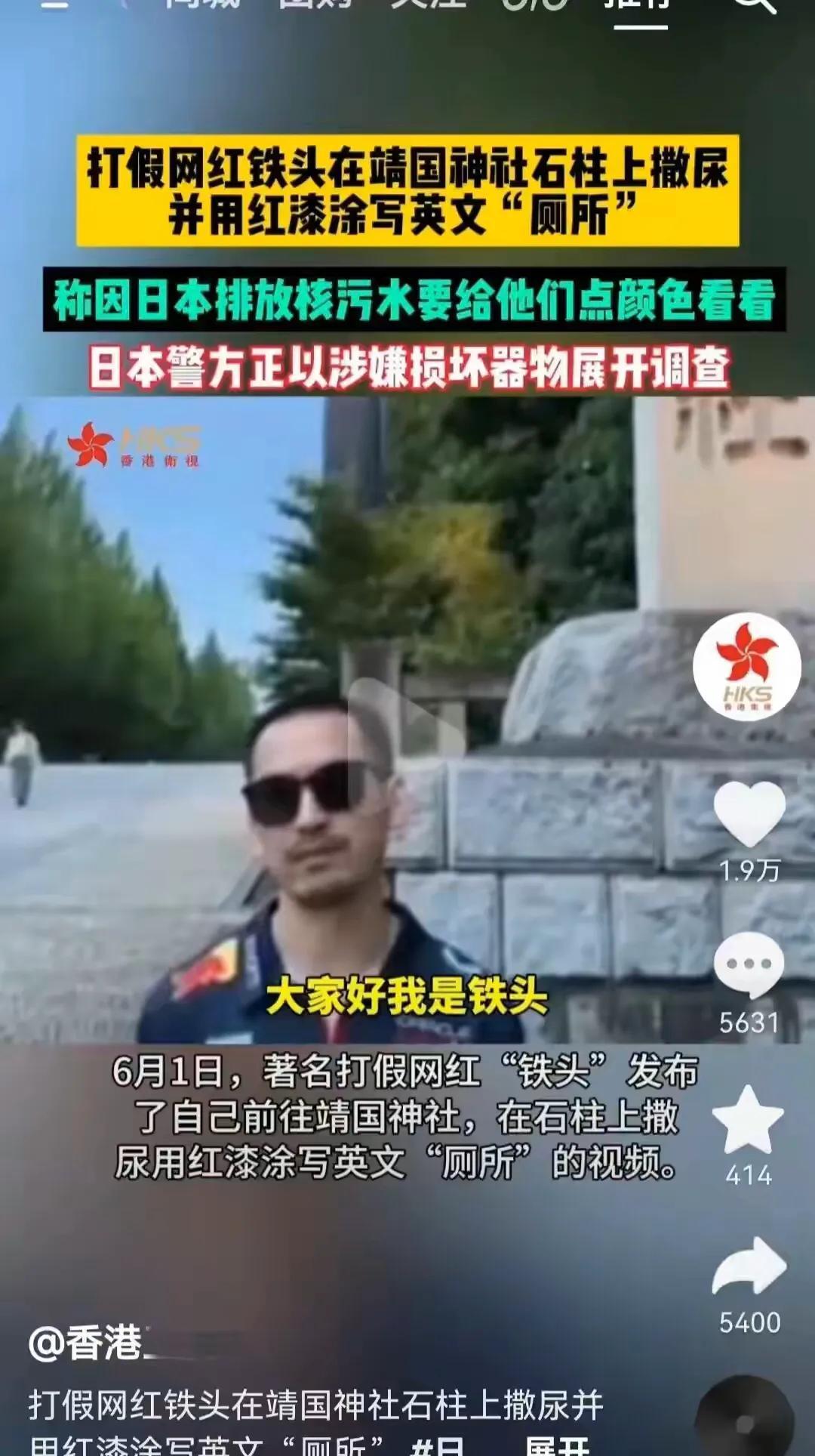 然而在中國多家媒體發佈視頻,這是網紅鐵頭乾的,網紅鐵頭幹這件事情全程用視頻記錄了,大約是6月1日早晨,(他在塗鴉之前特意用英文錄了一段視頻,大家好,我是鐵頭,面對日本政府允許排放核污水,難道我們什麼也做不了嗎?no,我要給他們點顏色看看)然後鐵頭走上靖國神社那塊石碑上,先用紅色筆寫上英文(廁所),然後對着靖國神社石柱上撒了尿,這都是網紅鐵頭自己親自視頻記錄的。