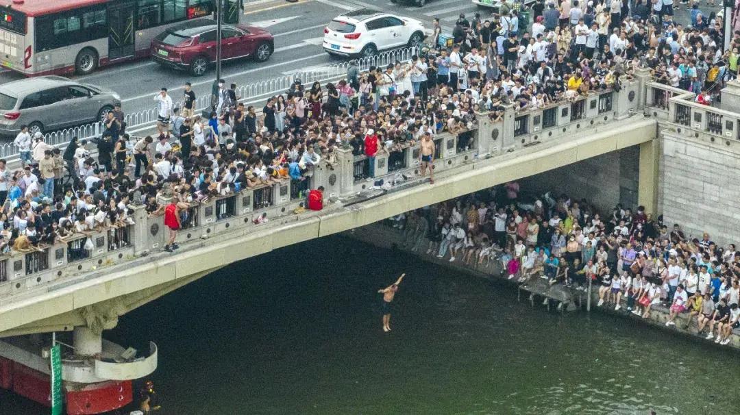 天津大爺大媽們跳水前的各種花式開場白、幽默風趣的觀衆互動、姿勢各異的入水動作,使海河上的獅子林橋被遊客戲稱爲“8A級”景點,本質上包含老當益壯、積極向上、不服輸的運動精神和人生態度。