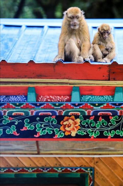 在古木與竹林相間的神祕的原始森林中沿公路穿行,在峭壁懸崖旁、在原始森林裏、在飛流瀑布下邊嬉鬧的猴羣。