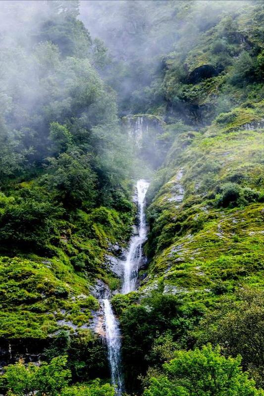 進入勒布溝,極目遠望,山頂白雪皚皚,銀光閃爍;山腰嬌翠欲滴,雲煙嫋嫋;山下溪流蜿蜒,瀑布飛流。