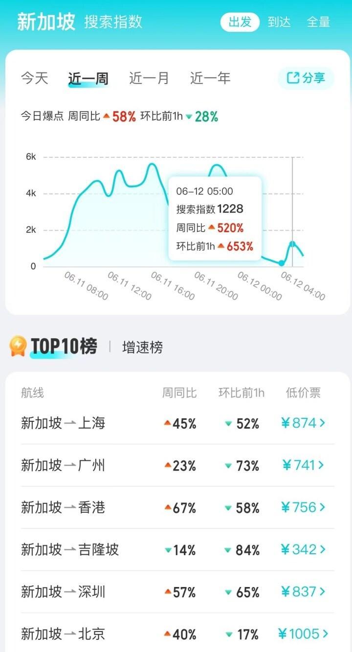 同程旅行數據顯示,6月11日至12日,新加坡旅遊搜索熱度環比上漲超過6倍,創下今年以來的熱度峯值。來自廣東、江蘇、上海、福建、浙江等地的用戶最關注新加坡旅遊信息,新加坡的酒店搜索熱度環比漲幅也達到245%。