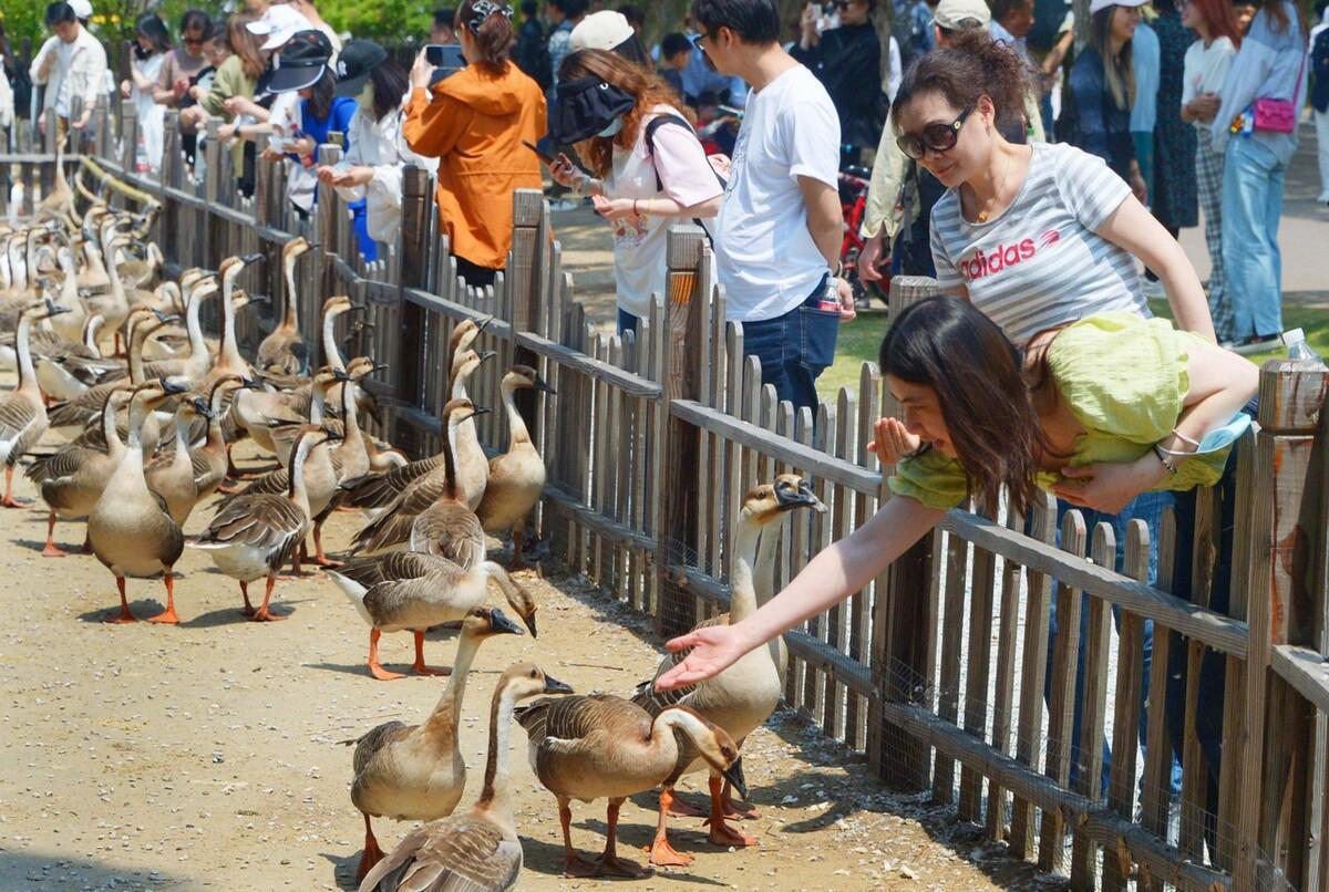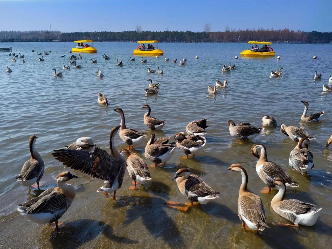 景區最有特色的就是每日兩場的大雁放飛表演,分別是上午10:30和下午14:00。時間一到,飼養員會打開籠子,隨着哨音一響旗幟搖動,大雁們便分批起,整齊劃一地飛向明珠湖的上空,並落在湖面上。那一刻,整個天空都被大雁們佔據,場面很壯觀。遊客們也可以在園區裏買些專門的飼料喂大雁,和大雁親密互動。