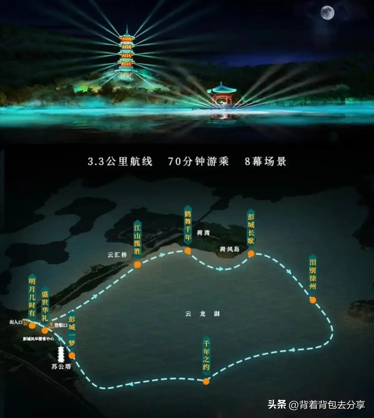 從雲龍山西門南出,到金山公園約1.5公里,步行約20分鐘到達,這邊有蘇公塔→小南湖→蘇軾紀念館,整個雲龍湖較大,可以騎共享電車,環湖領略湖光山色,也可以乘坐旅遊觀光車或遊船,晚上還可以去金山公園,看一場超震撼的彭城風華大型水上演出,(優惠價238元)